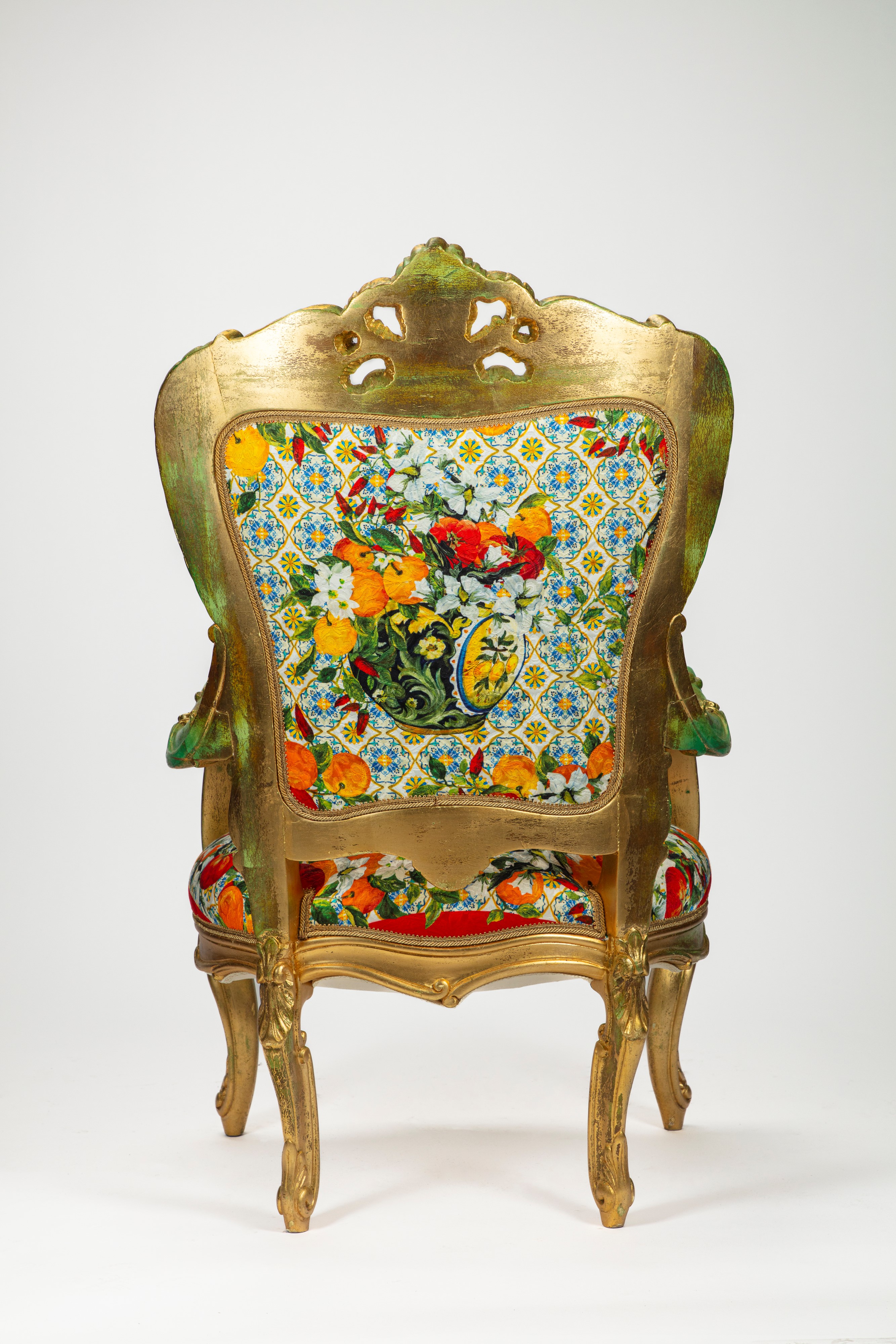 A 19th century gilt-wood armchair, covered with Dolce and Gabbana fabric, from the collection of mr. Stefano Gabbana