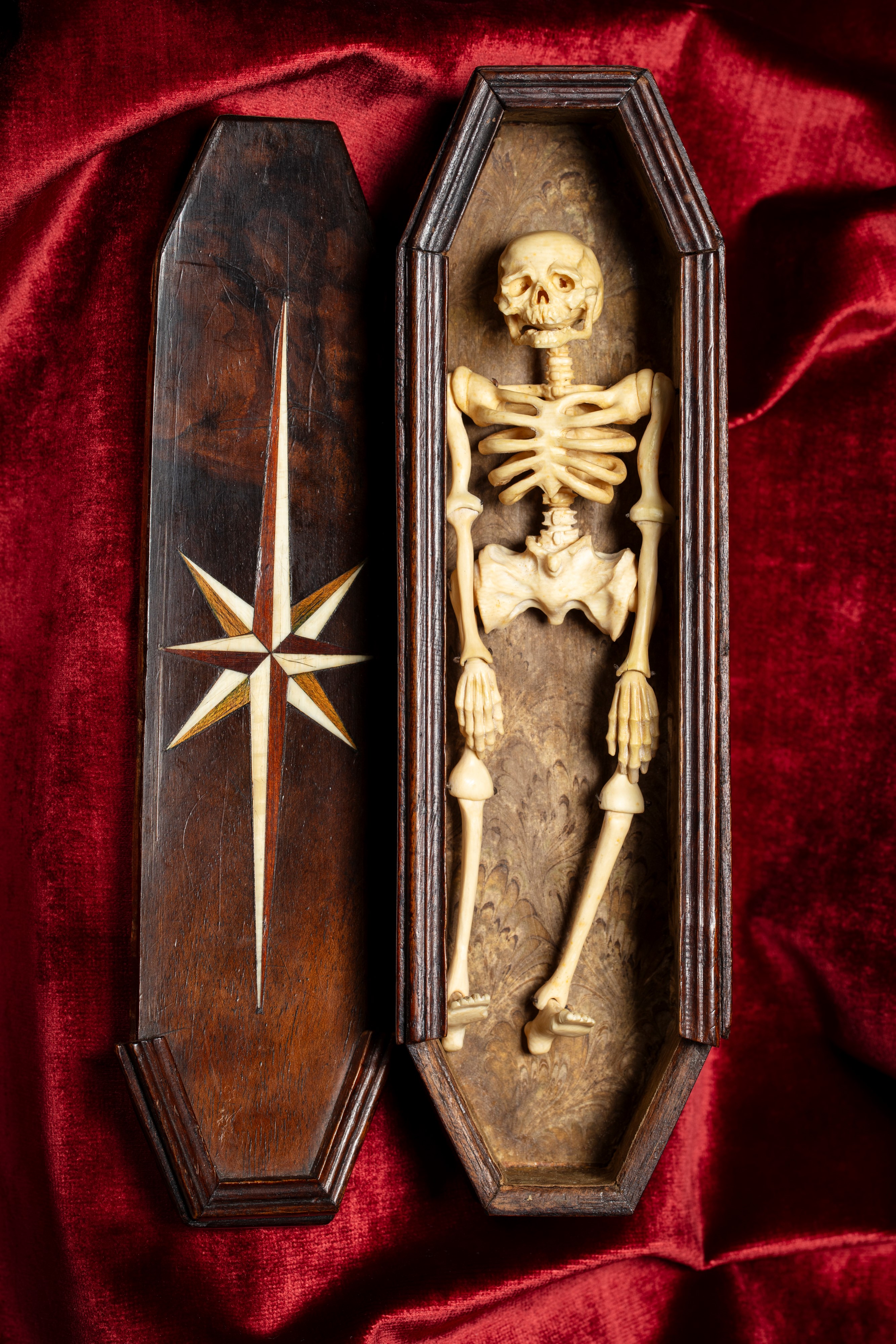 A 19th century memento mori, inlaid wood coffin with an ivory skeleton.