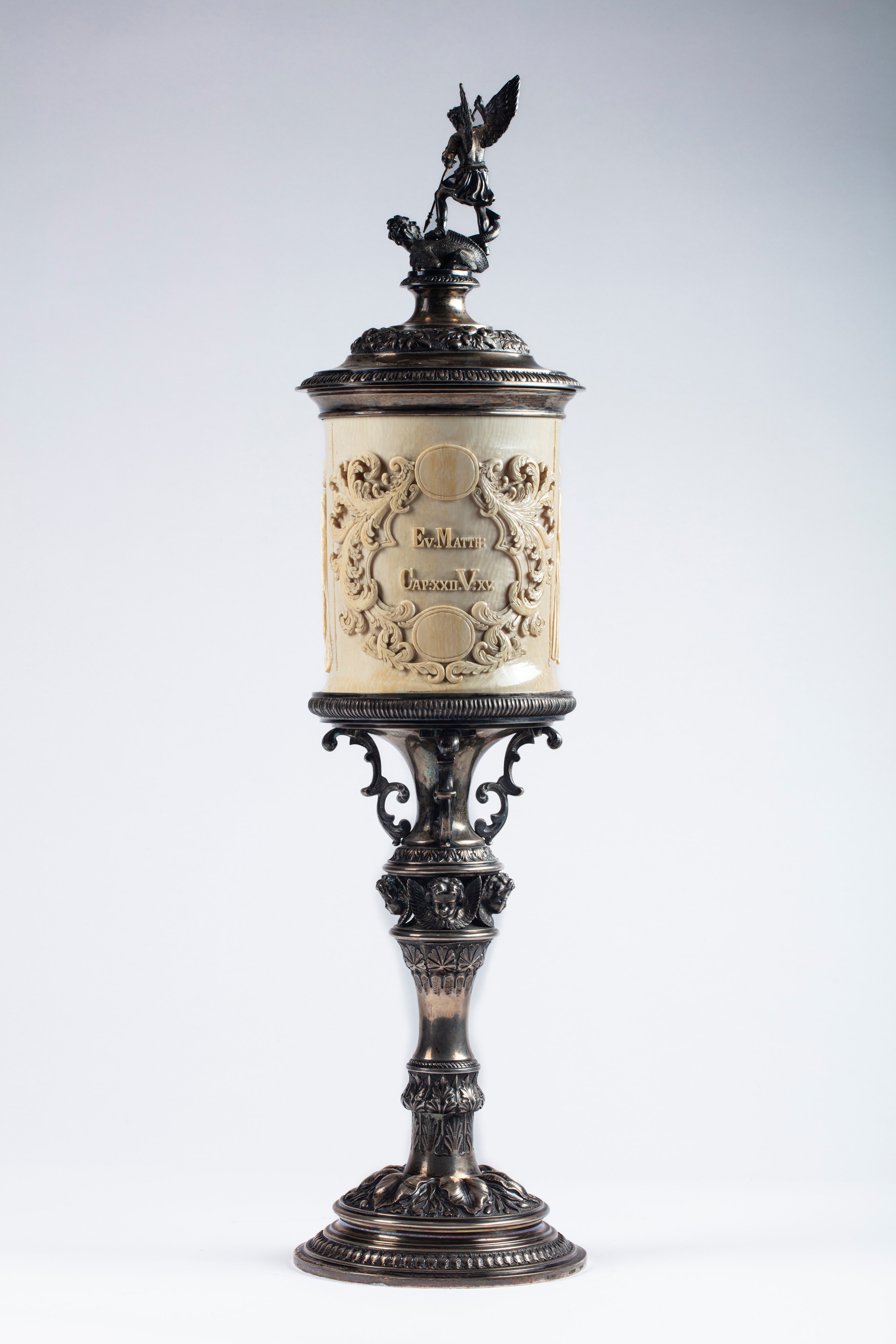 ivory cup carved on the front with a relief scene from the parable of the wedding feast from the Gospel of St. Matthew, monogram “IJF” at the bottom of the side column. On the back inscription in a reserve with foliate scrolls 'Ev. Matth: Cap:XXII.V:XV'. Circular foot with palmette profile engraved on the rim “13 loth G.NETTO BERLIN”, leaves and flowers on the base, the stem embossed and chiselled with cherubs and double volutes, the lid socket surmounted by all-round St. George and the dragon. Interior in vermeil.