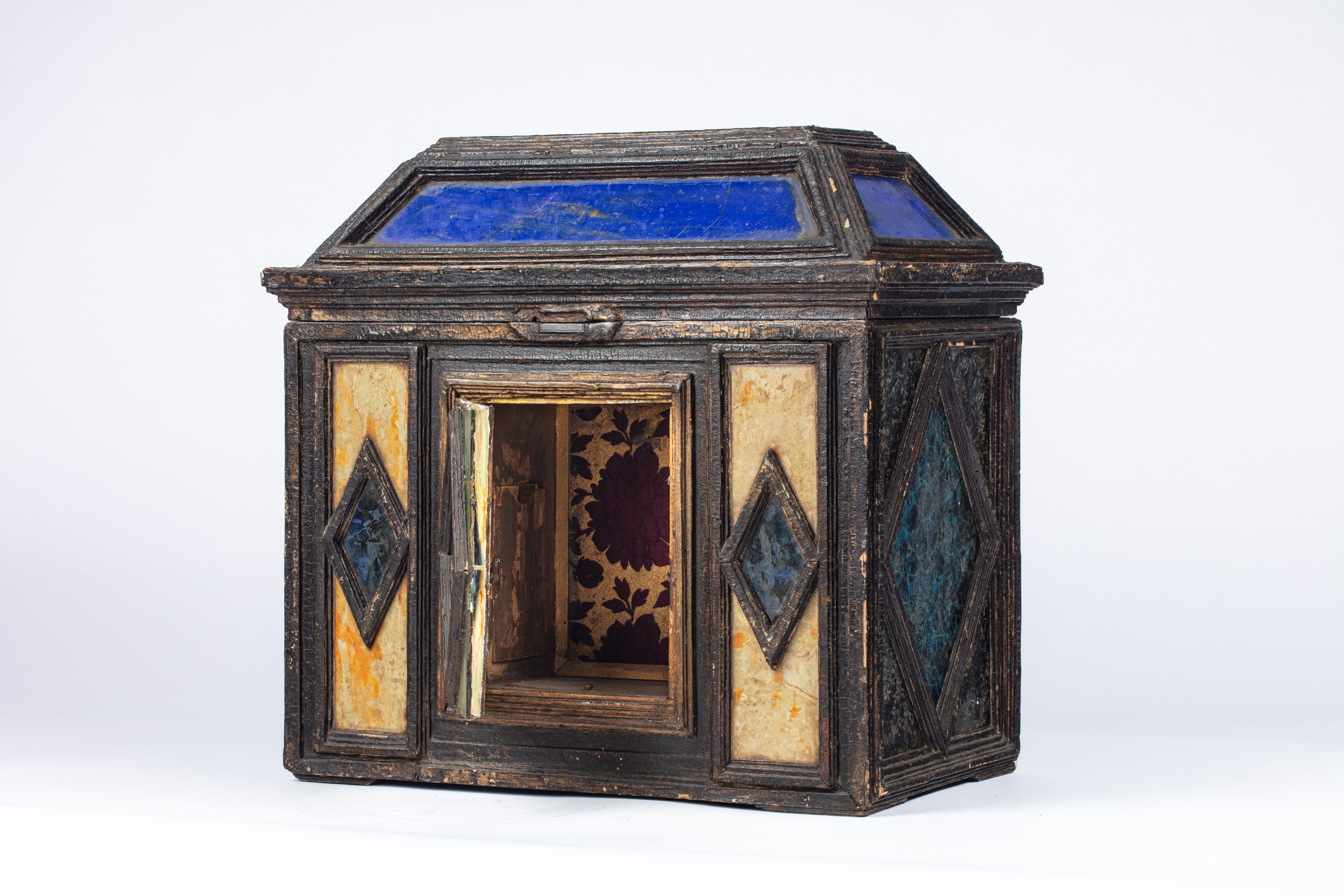 the front with drawers, the back with a door concealing further drawers, defects and losses