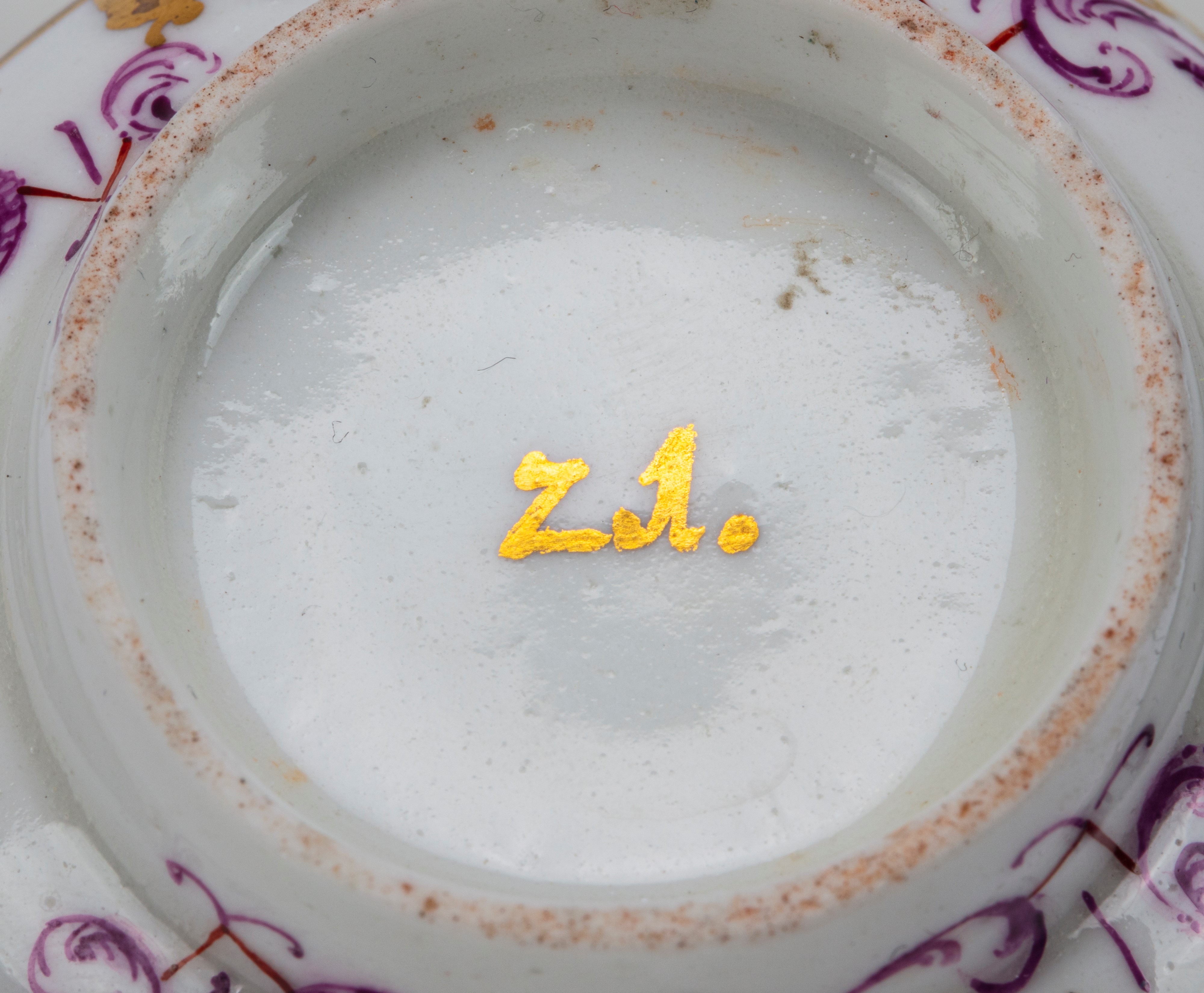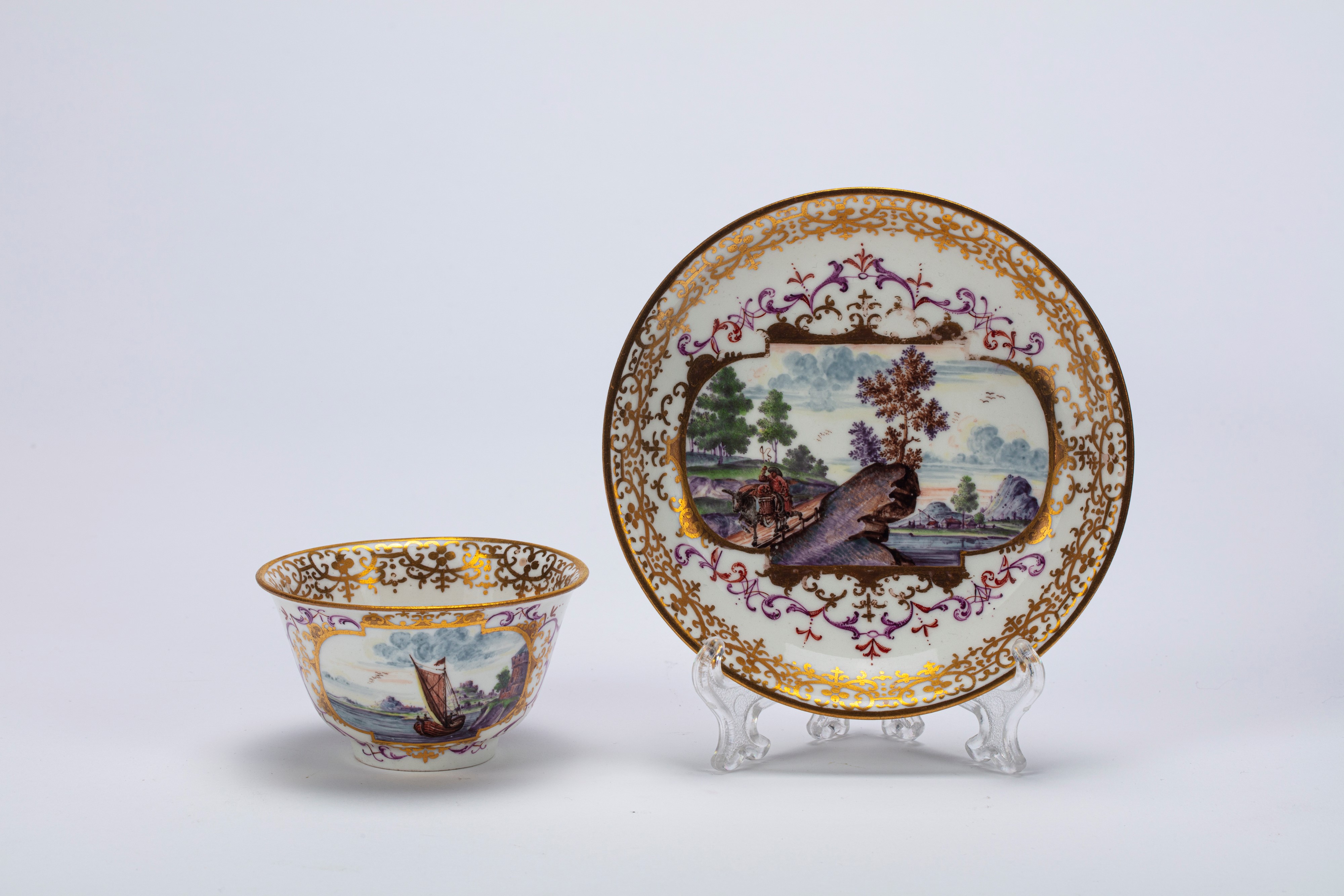 finely decorated with European views with wayfarers and sailing ship in river landscapes within gold, purple, and copper red cartouche reserves, inside cup sprig with indianische Blumen within concentric copper red circles. Gold numeral 21 below bases.