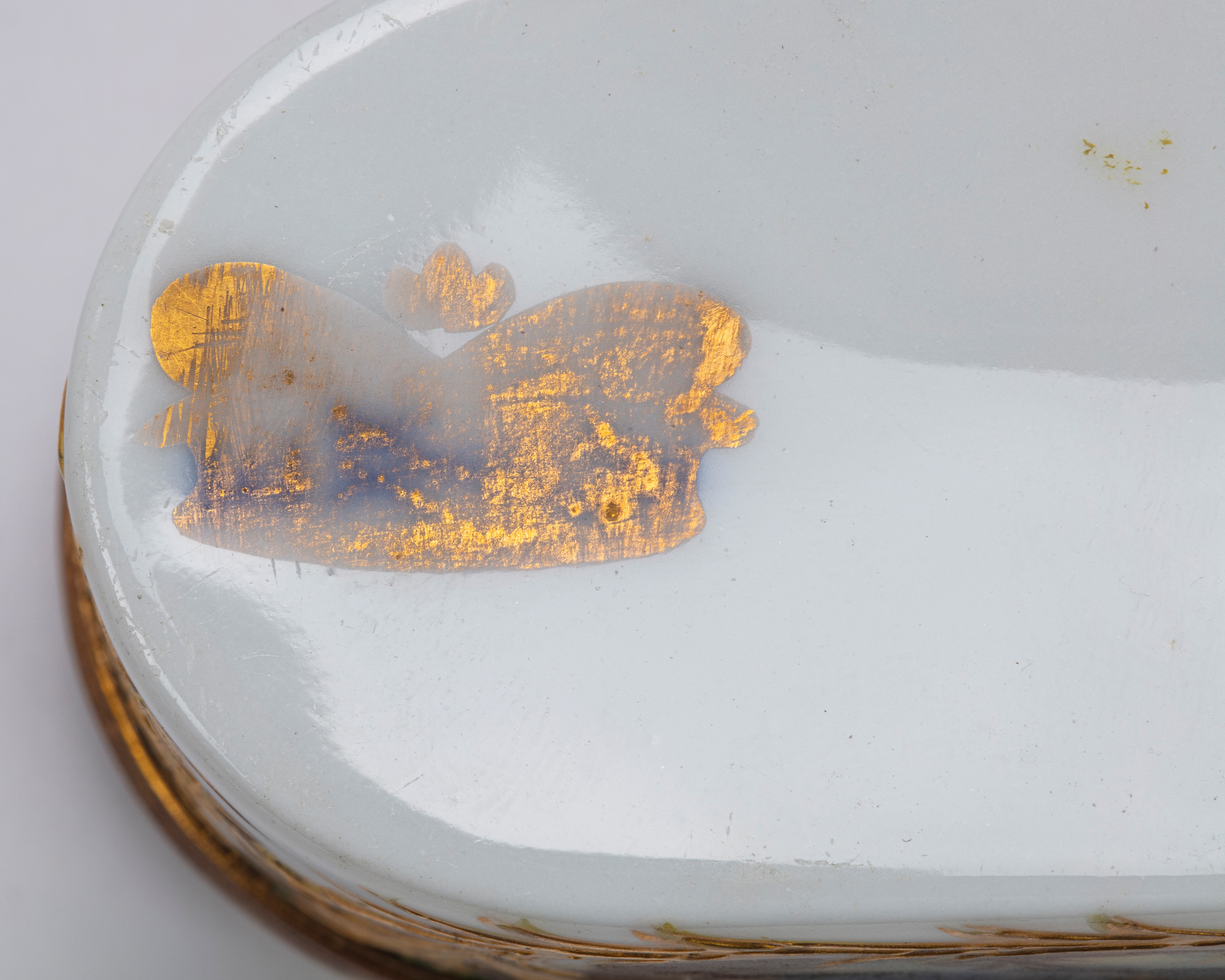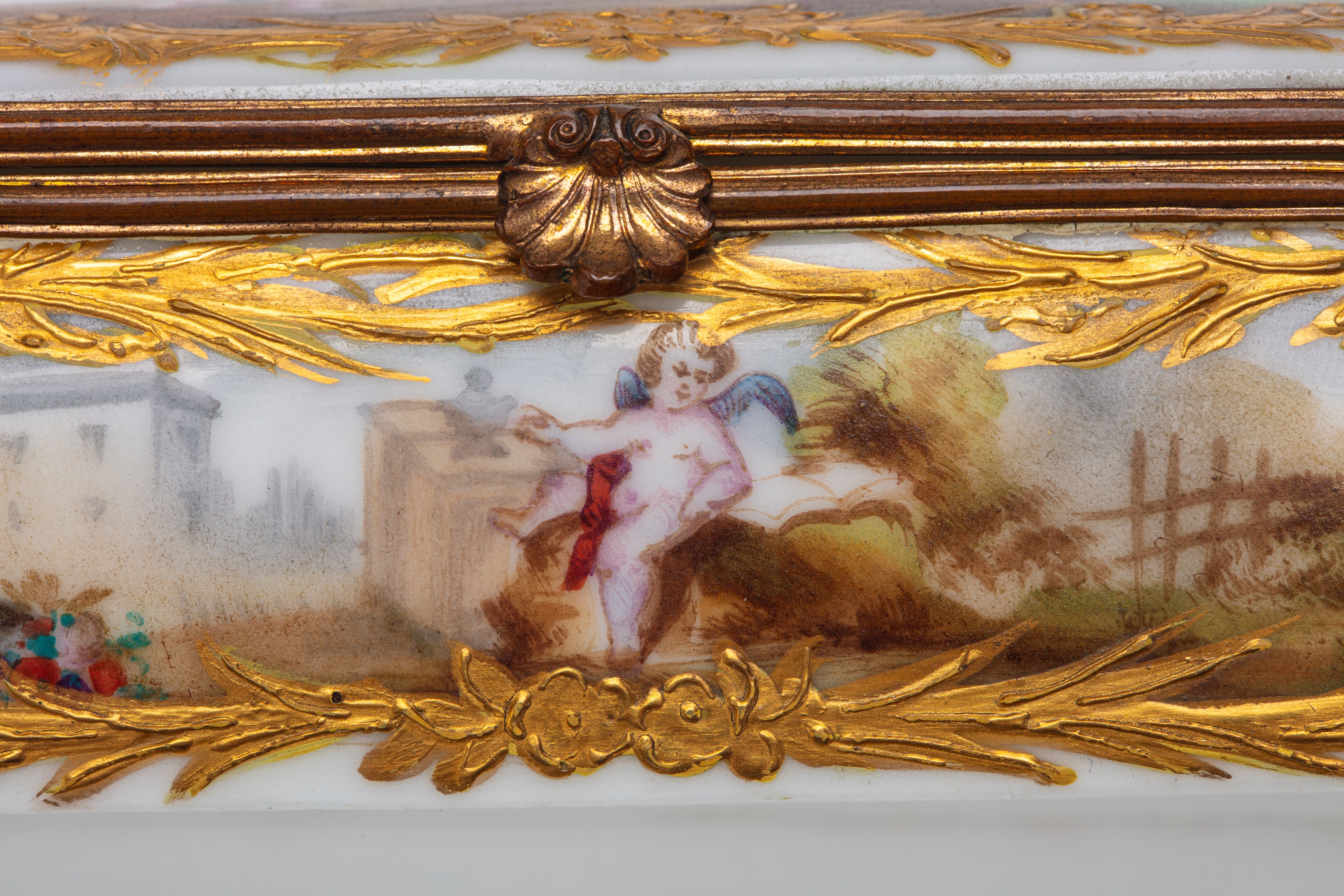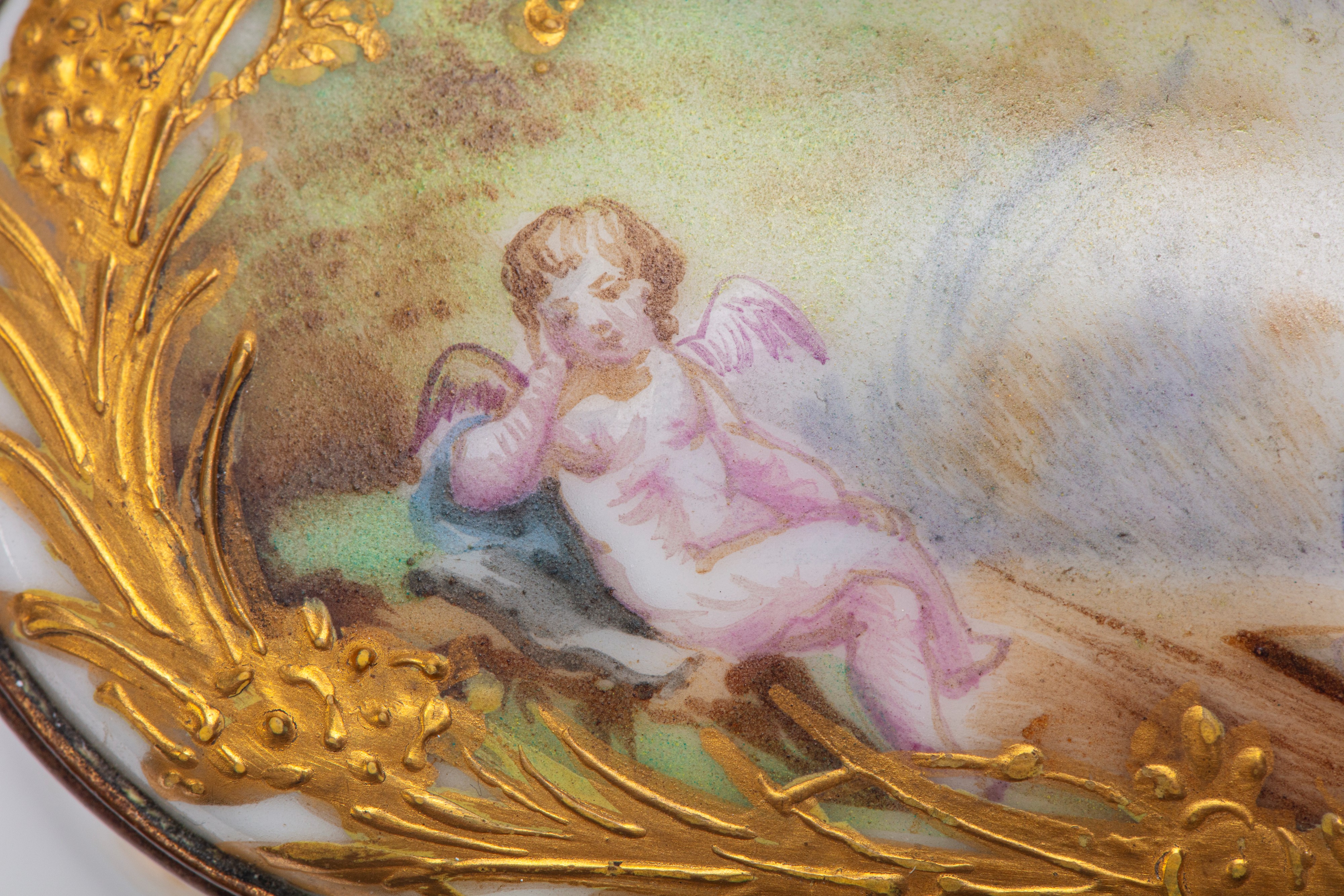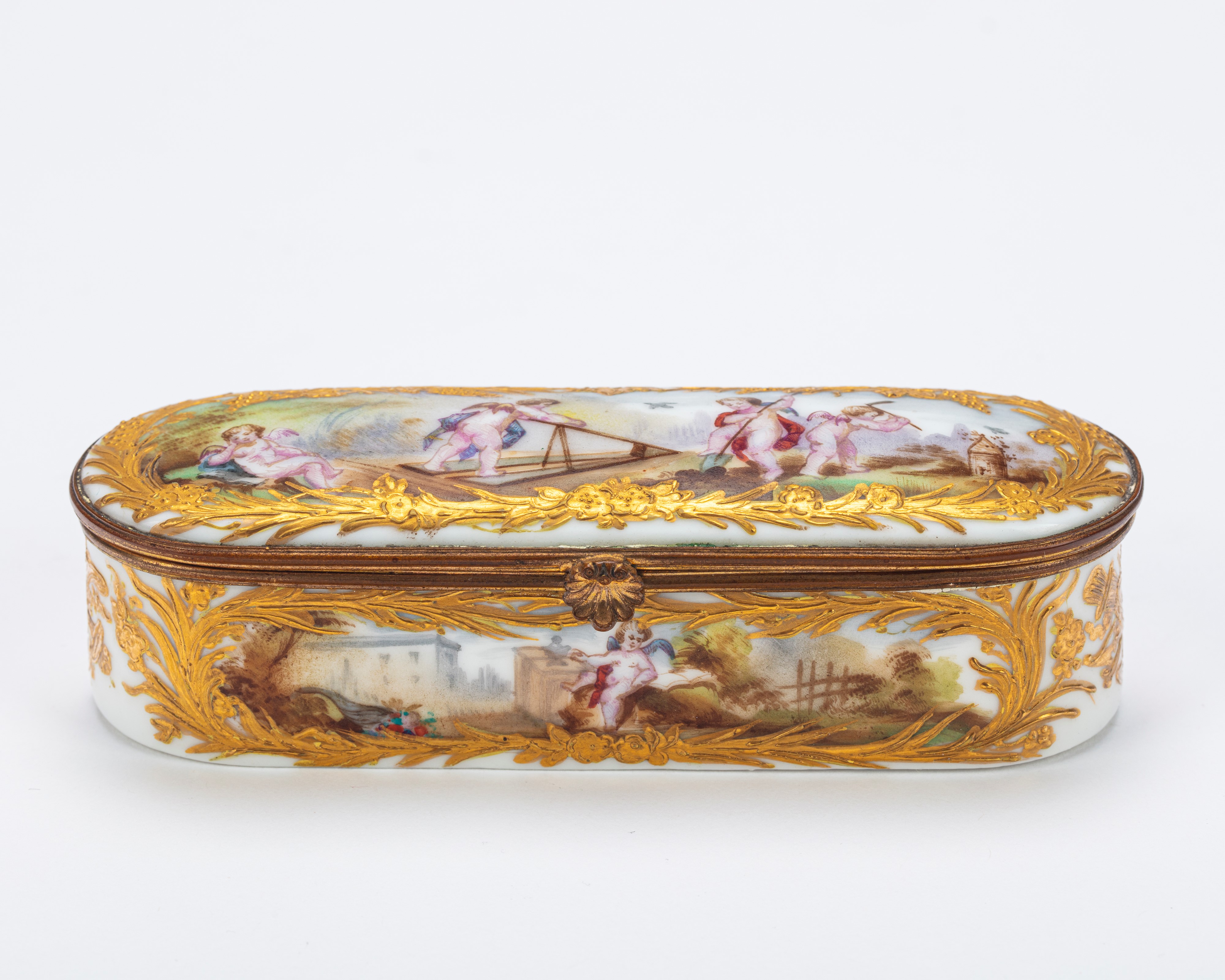 Di forma ellittica in porcellana decorata in policromia sul coperchio e nelle fasce da putti in paesaggi agresti entro riserve rocaille dorate a rilievo. Marca di fabbrica.