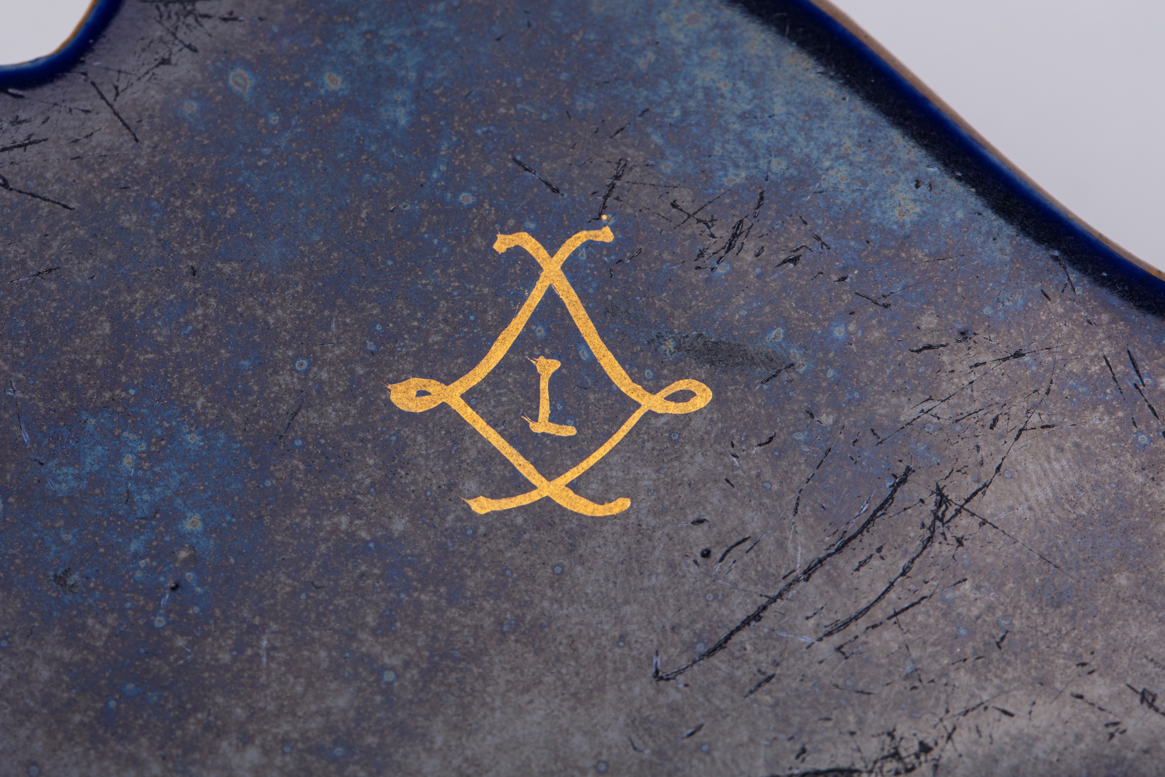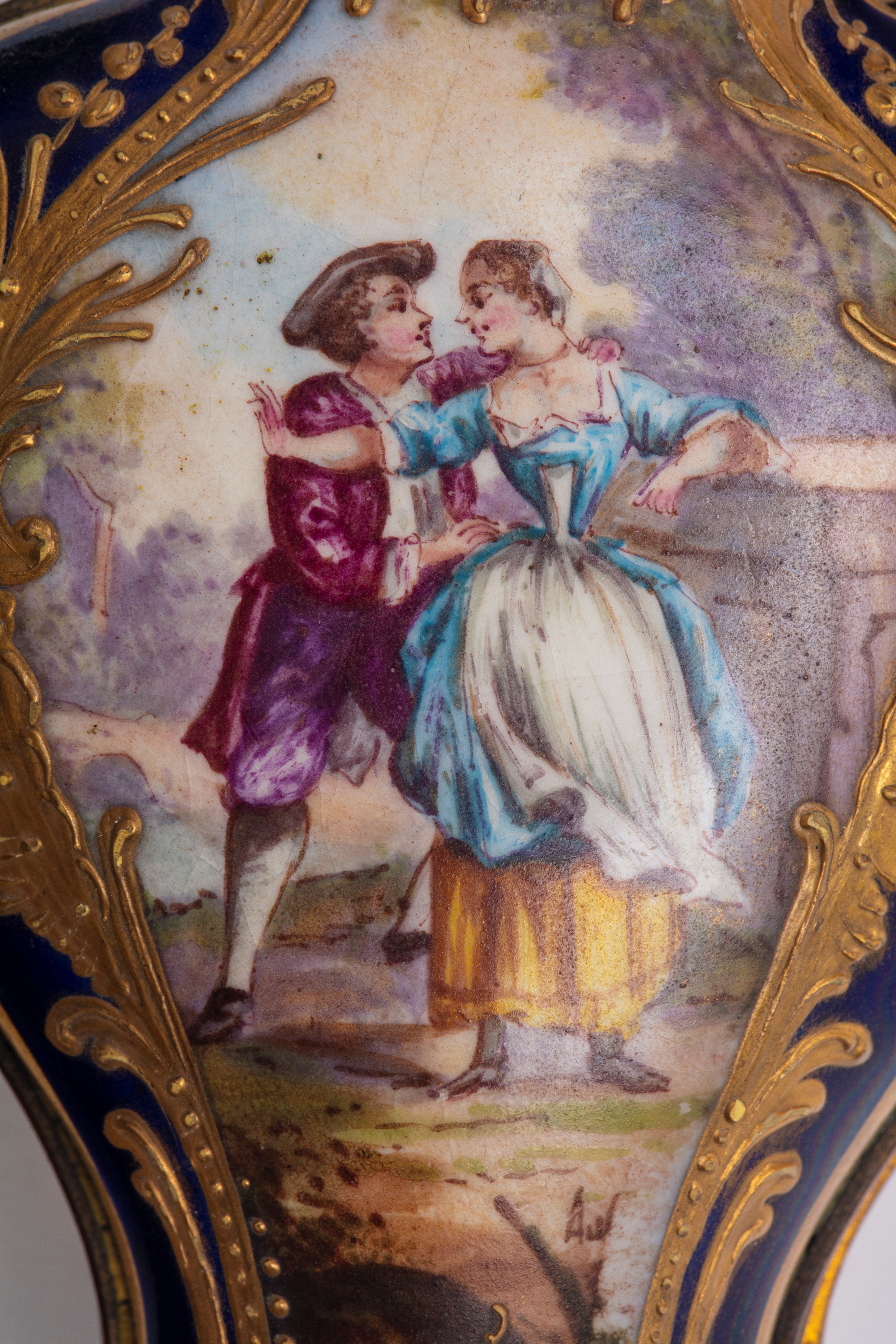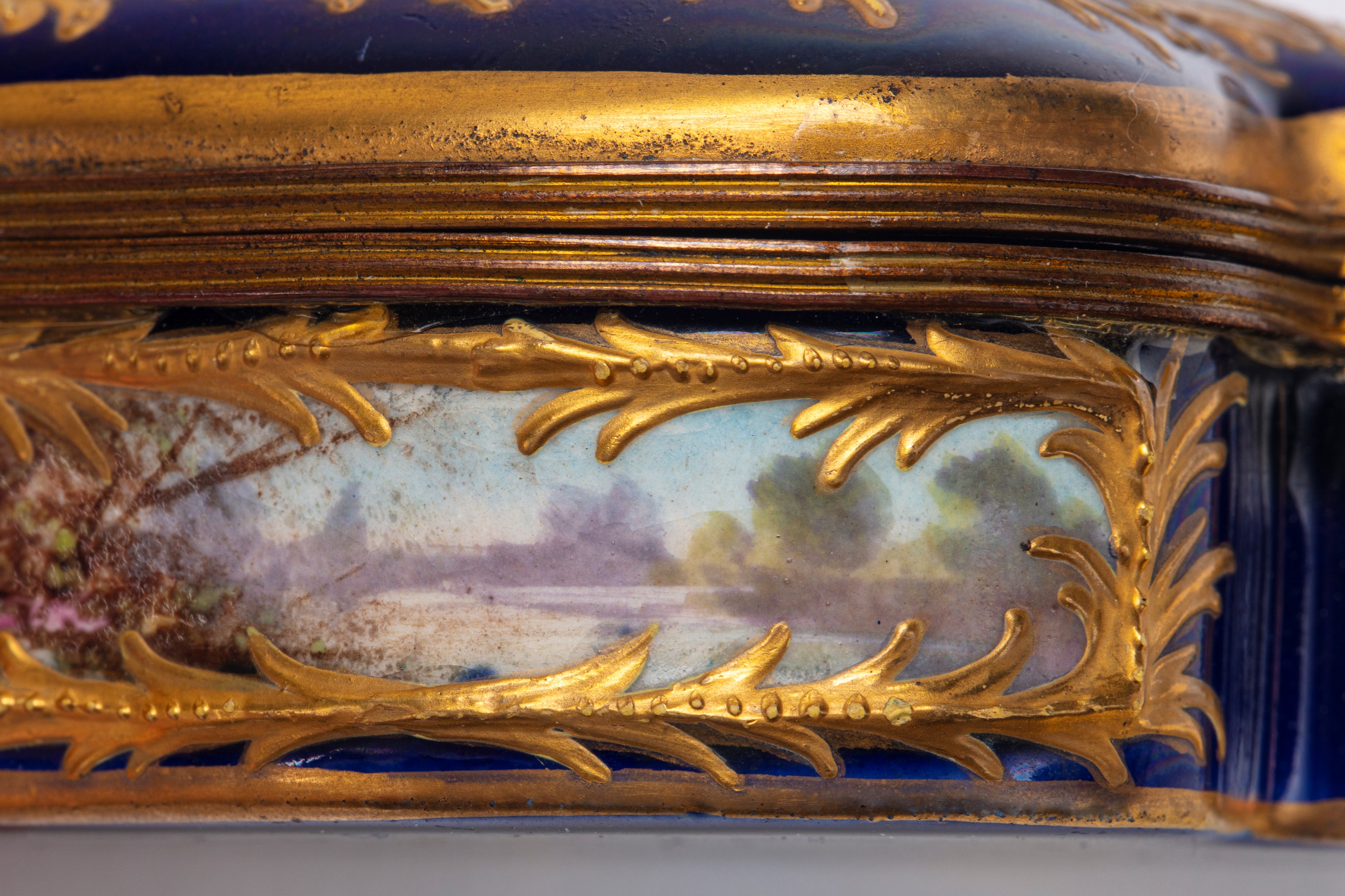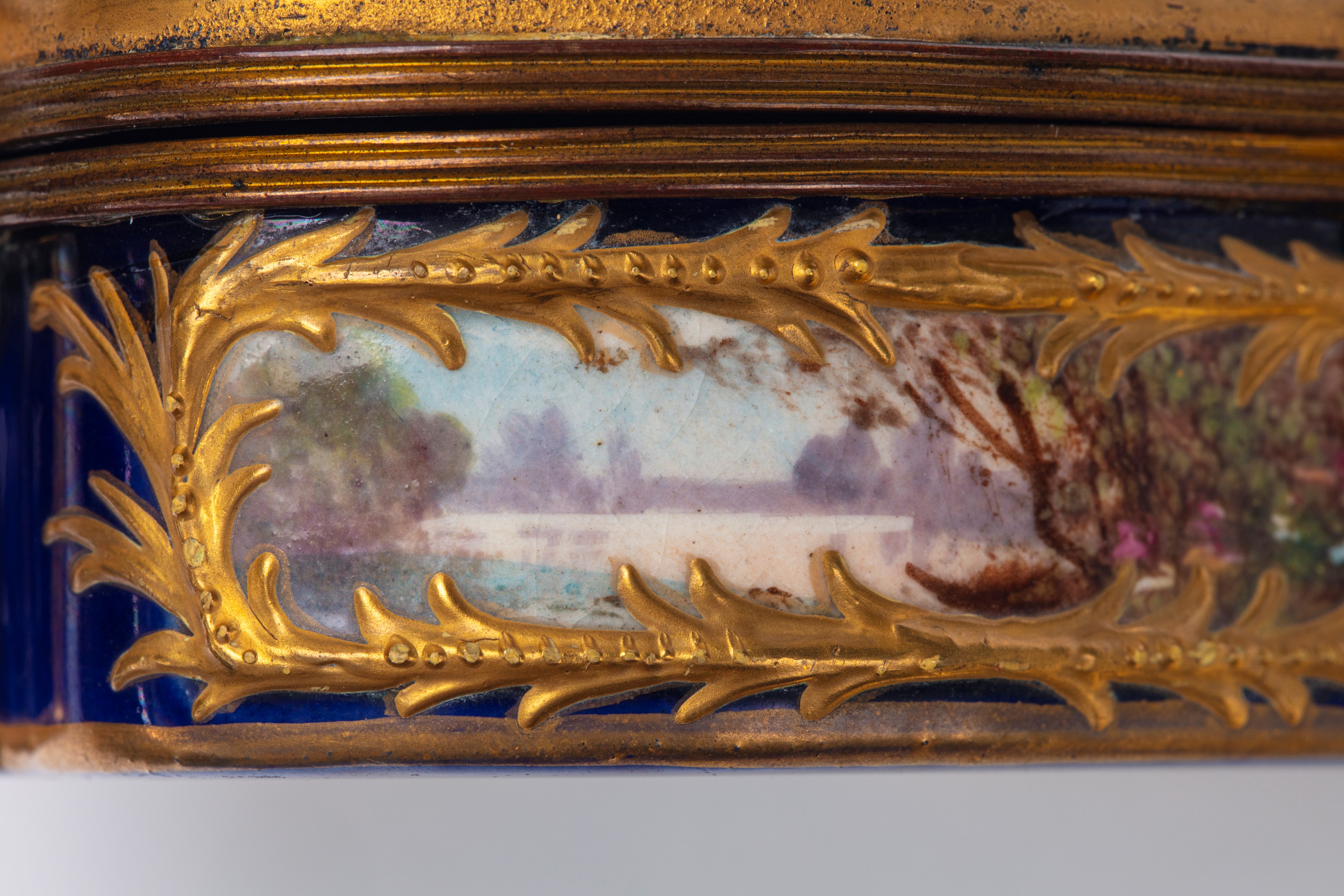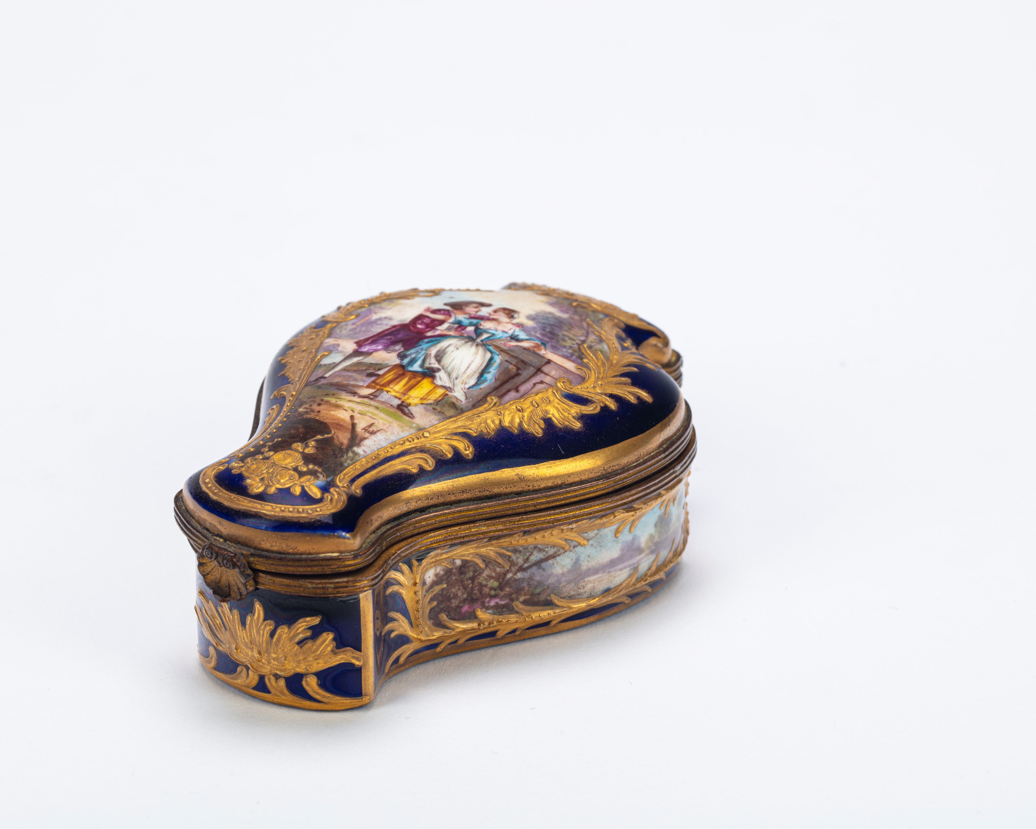 Di forma sagomata in porcellana a fondo blu con profili e riserve dorate a rilievo a volute e foglie, il coperchio decorato da scena galante in un paesaggio agreste, le fasce da vedute. Marca sotto la base