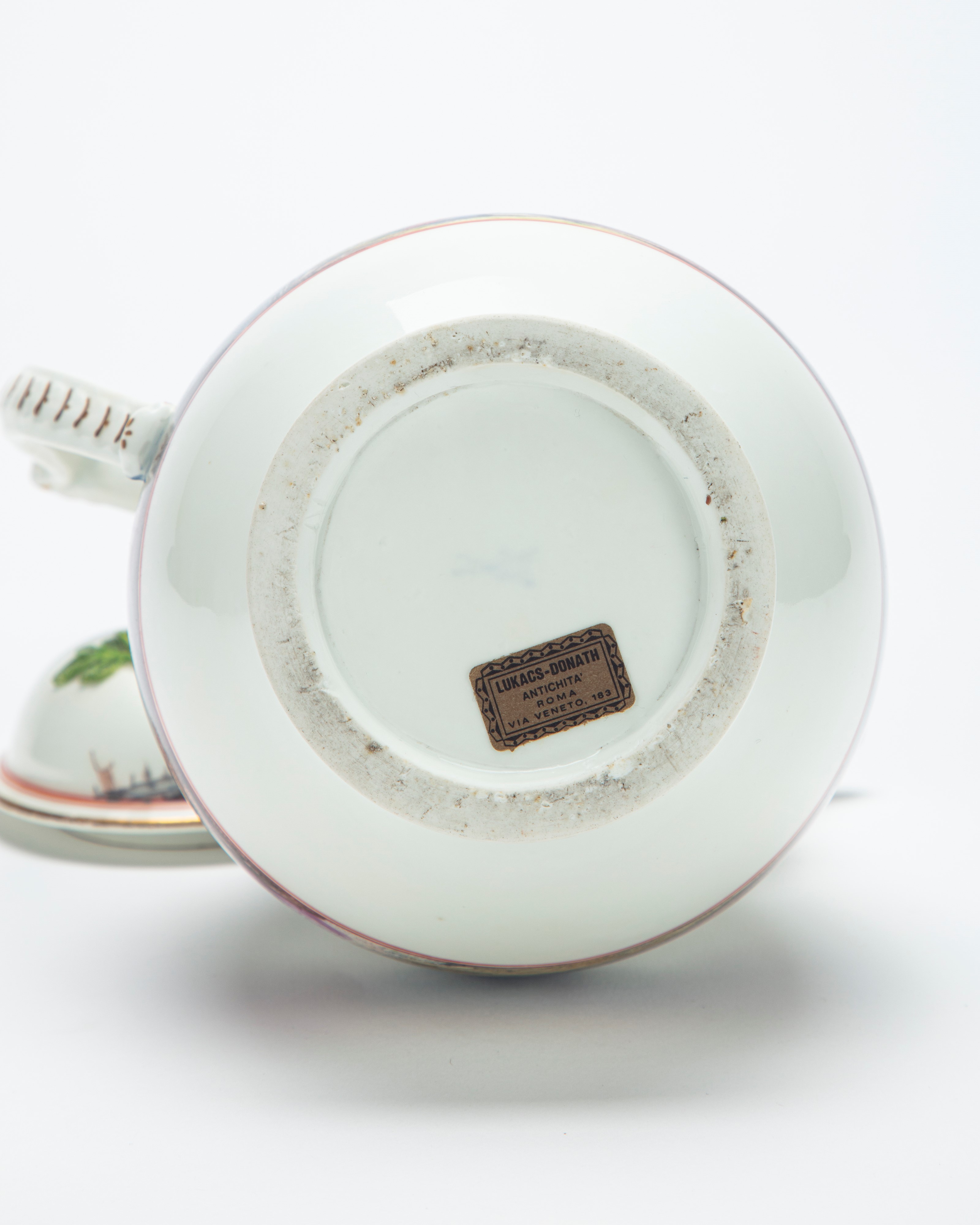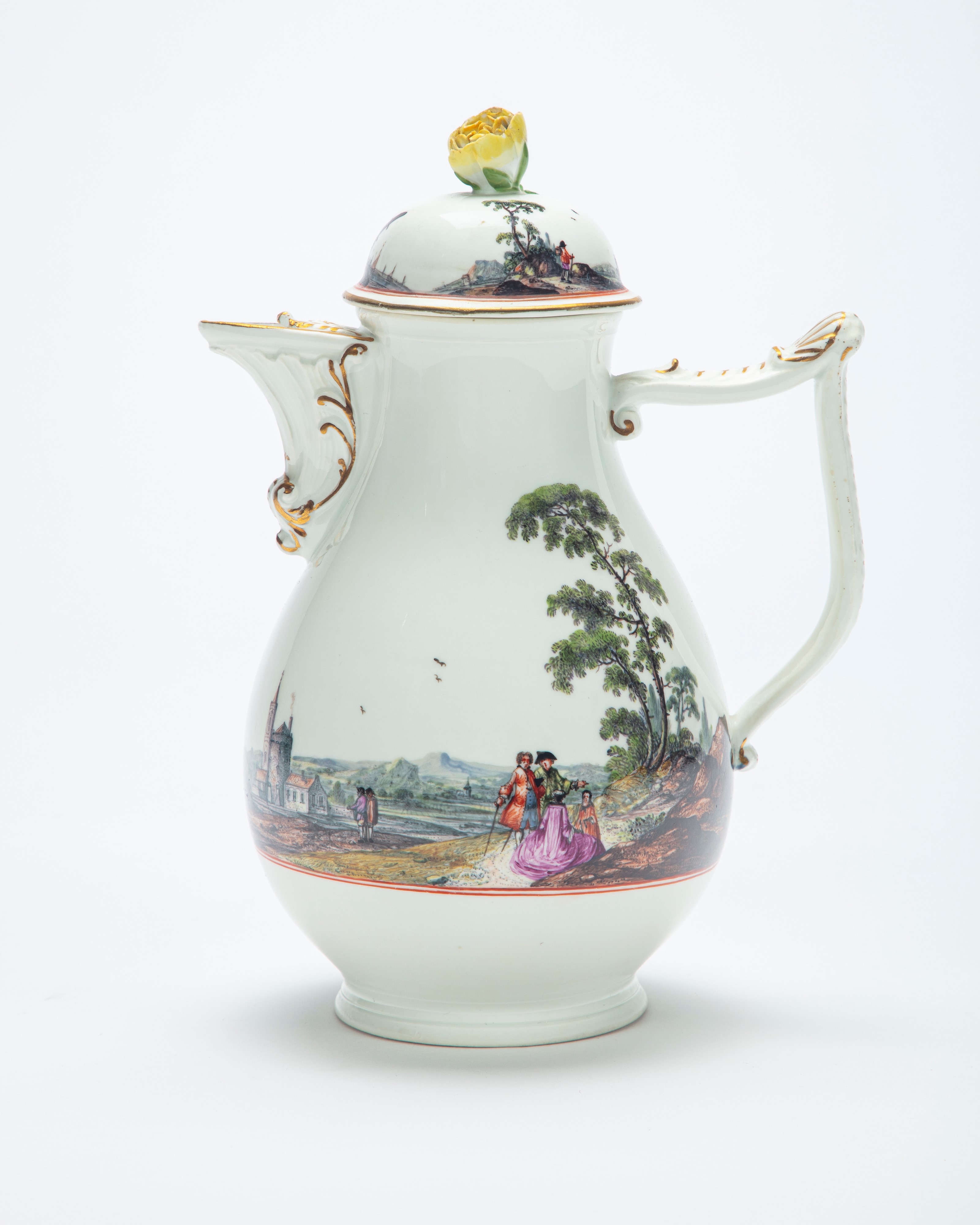 Polychrome porcelain decorated with continuous harbor scene (“kauffahrtei”) in the manner of Christian Friedrich Herold. Factory mark, paper label of provenance Lukacs-Donath Antiquities Rome (restoration to the grain of the grip)