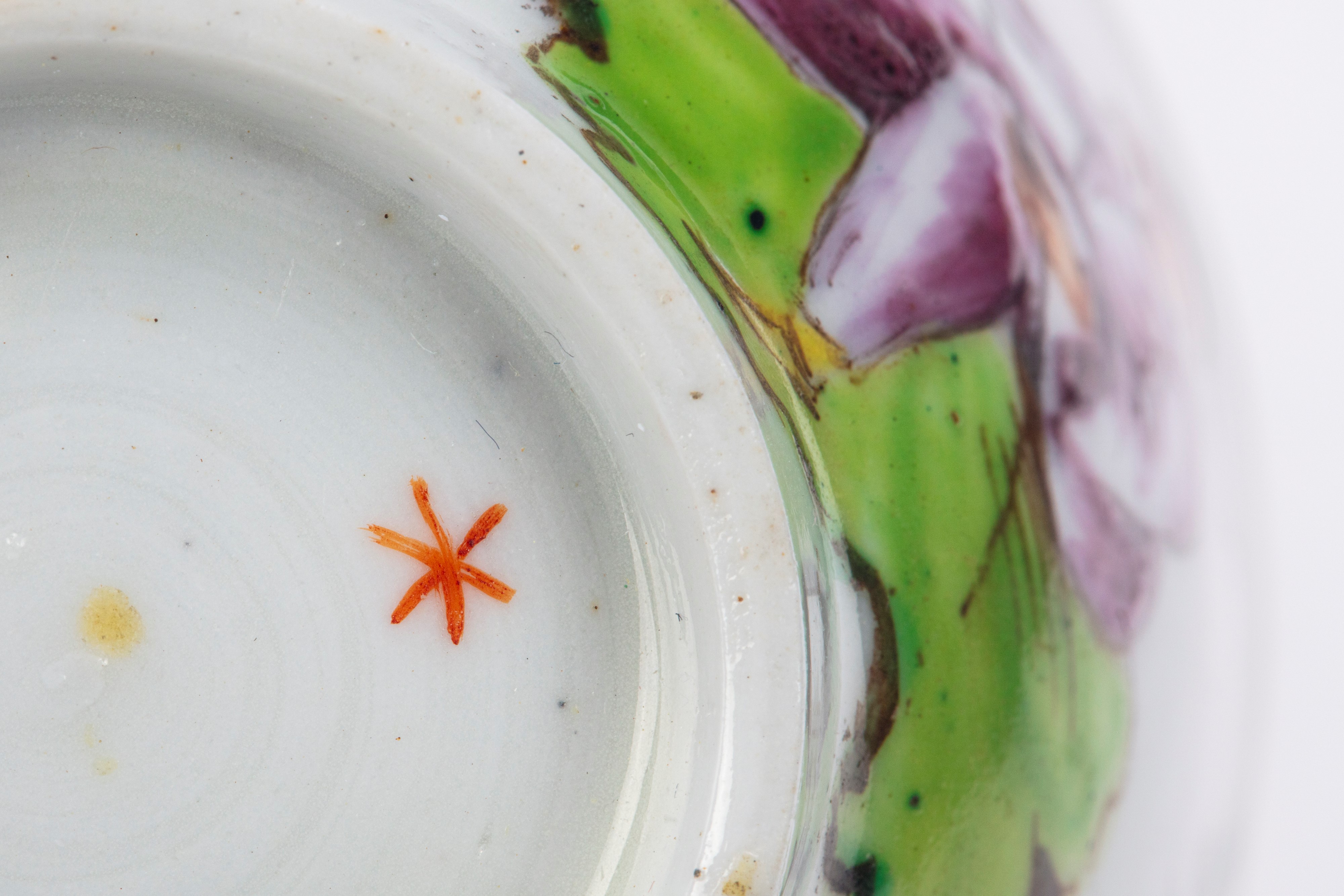 a coppetta su base ad anello decorata in policromia a chinoiserie con figura di orientale con un fiore in mano, seduto su una zolla erbosa mentre gioca con un uccello tra alberi fioriti. Al retro pagoda stilizzata con una torre. Marca di fabbrica: stella rossa