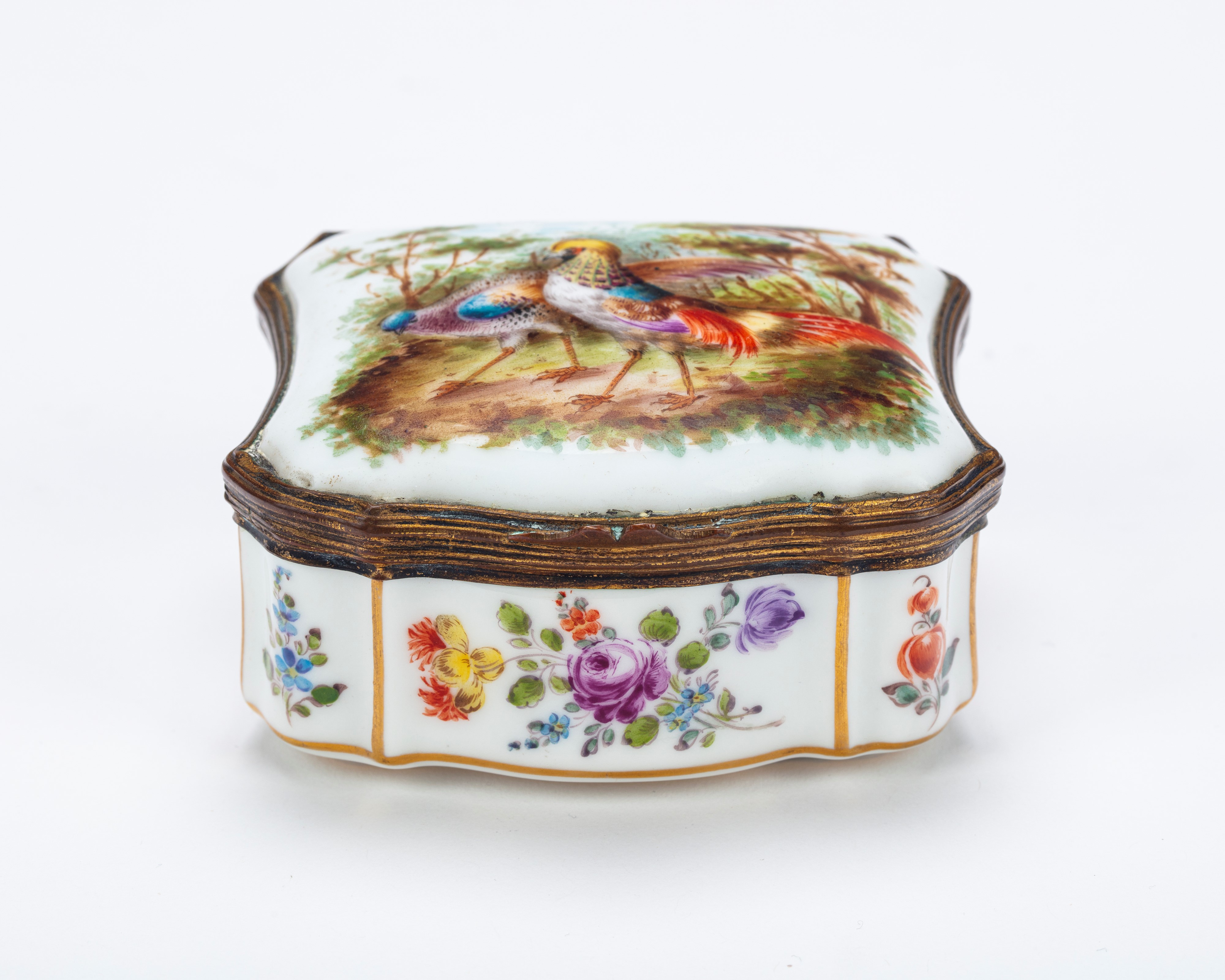 di forma mossa decorata in policromia a bouquet di fiori lungo i bordi e a fagiani in un paesaggio agreste sul coperchio. Marca di fabbrica.