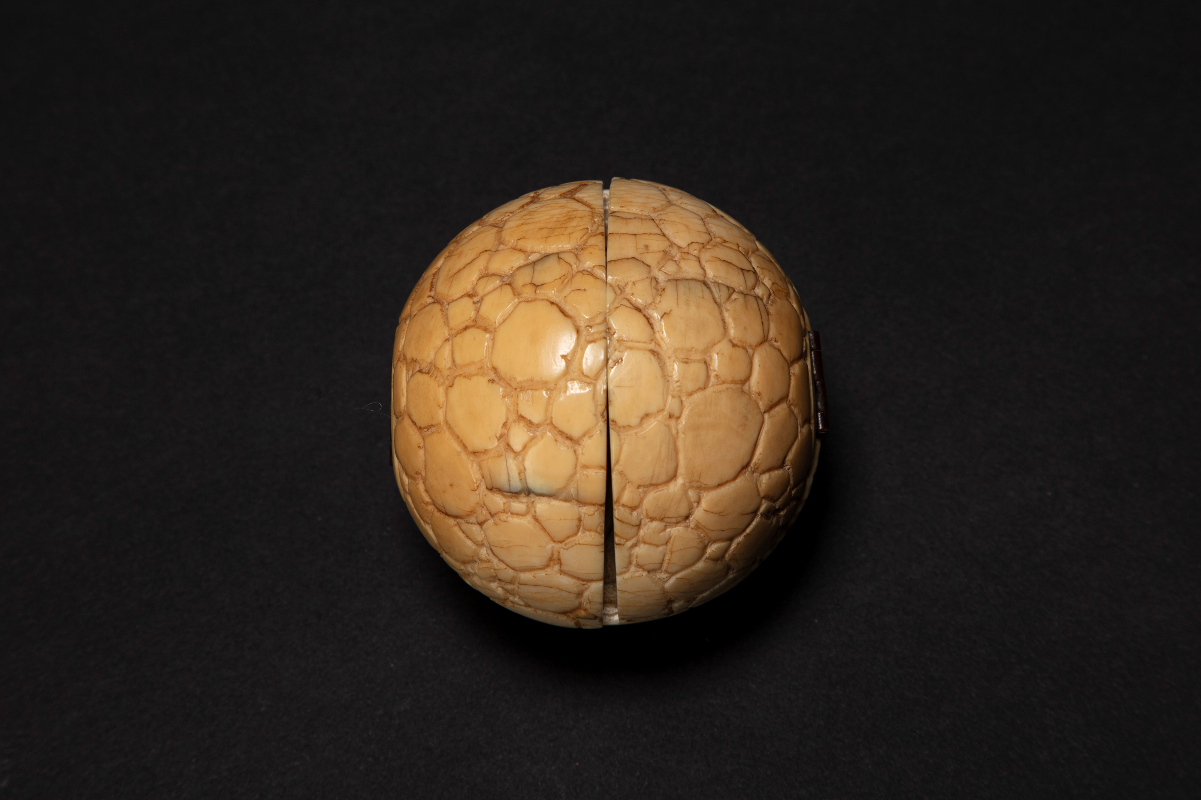Spherical triptych in the form of a two-leaf folding shell, internally carved with devotional scene. 19th century