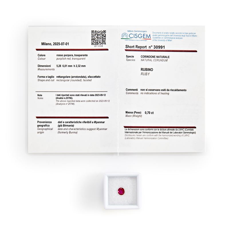 The ruby is accompanied by short report no. 30991 of 01/07/2025 CISGEM, Milan, and verbal analysis no. 25796.