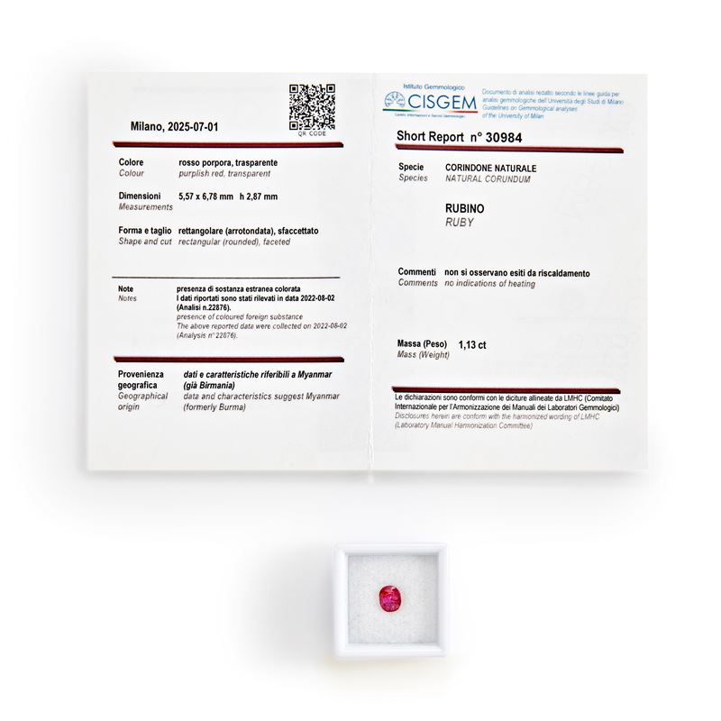 The ruby is accompanied by short report no. 30984 of 01/07/2025 CISGEM, Milan, and verbal analysis no. 22876.