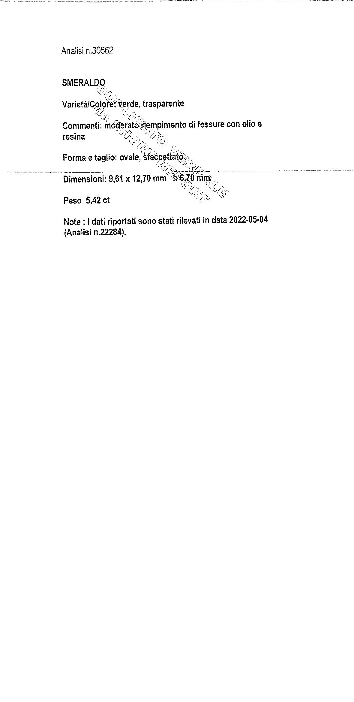 The emerald is accompanied by short report no. 30562 of 05/05/2025 CISGEM, Milan, and verbal analysis no. 22284.