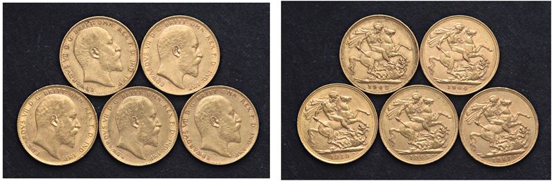 EDOARDO VII (1901-1911) - Lotto di 5 sterline (1902 P, 1903, 1904 S, 1905 P, 1910 M)