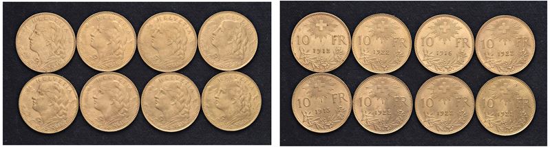 Lotto di 8 esemplari da 10 franchi.