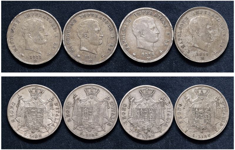 Lot of 4 5 lire coins, II type, (1808, 1810, 1811, 1814), Milan.