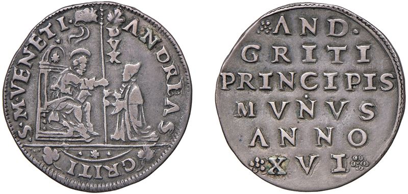 Obverse: Saint Mark, seated on a throne to the left and facing right, blesses with his right hand and offers the banner with his left to the kneeling Doge, who takes it with both hands; on the pennant a small lion in soldo and along the staff DVX; - Reverse: Inscription in six lines.