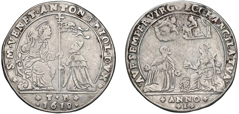 Obverse: Saint Mark seated on a throne, offering the banner to the kneeling Doge, who receives it in his hand. In the exergue are the initials TB (Tommaso Bragadin, farmer); - Reverse: The Doge, kneeling in prayer, raises his gaze toward the figure of the Madonna above him, with an angel. In front of the Doge is a personification of Venice, offering him the doge's horn.