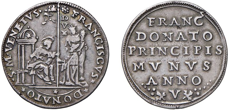 Obverse: St. Mark enthroned with a canopy, holding out the standard in his right hand to the kneeling Doge, who receives it with both hands; standing behind the Doge is Abundance with a cornucopia. Along the shaft, DVX; - Reverse: Inscription in six lines.