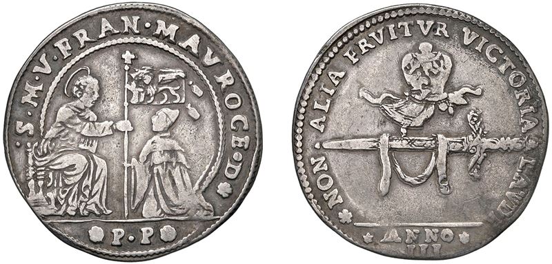 Obverse: Saint Mark enthroned presents the banner to the Doge, kneeling, who receives it with his hand, in the exergue the initials PP (Paolo Pisani, massaro); - Reverse: Sword placed horizontally with the Doge's hat above.