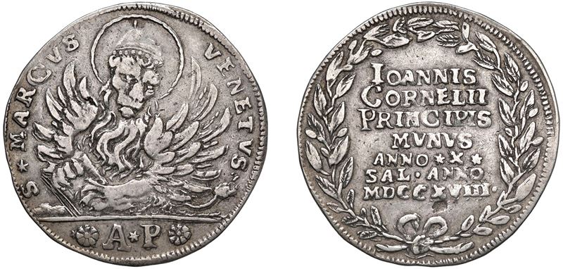 Obverse: Winged and haloed Lion of St. Mark, wearing a crown and ducal horn, seated with the Gospel between his paws; in the exergue, the initials AP (Alvise Pizzamano, farmer); - Reverse: inscription in seven lines, within a laurel wreath, tied at the bottom with a bow.