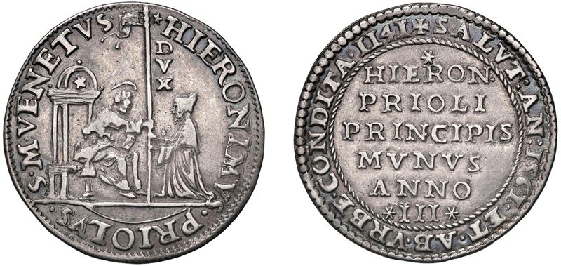 Obverse: Saint Mark enthroned with a canopy, holding out the standard in his right hand to the kneeling Doge, who receives it with both hands. DVX along the shaft; - Reverse: Inscription in six lines, within a beaded circle.