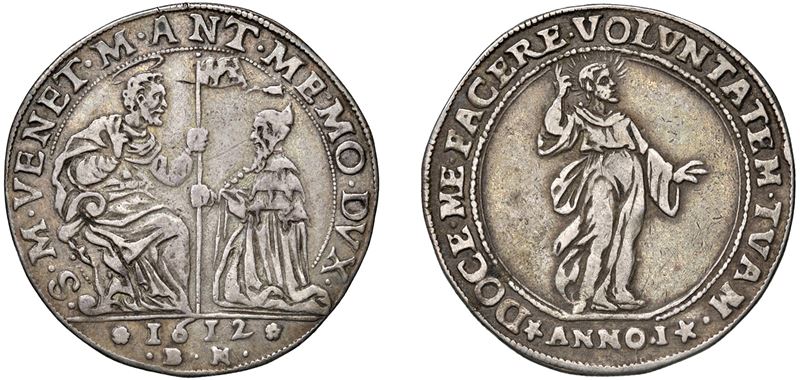 Obverse: Saint Mark seated on a throne, offering the banner to the kneeling Doge, who receives it in his hand. In the exergue are the initials BM (Bernardo Morosini, farmer); - Reverse: The Savior standing right, blessing.