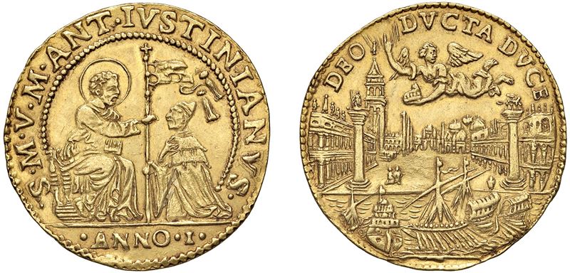 Obverse: Saint Mark enthroned, holding out the banner in his right hand to the kneeling Doge; - Reverse: View of the small square of Saint Mark with the bell tower and the shore of the pier with ships; an angel flies towards the Giustiniani house.