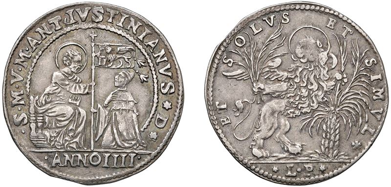 Obverse: Saint Mark enthroned, holding the standard in his right hand to the kneeling Doge; - Reverse: Lion of Saint Mark, standing on its hind legs, resting with one forepaw on a large palm tree, and holding one of its branches in the other. The initials LP (Lunardo Pisani, massaro) appear in the exergue.