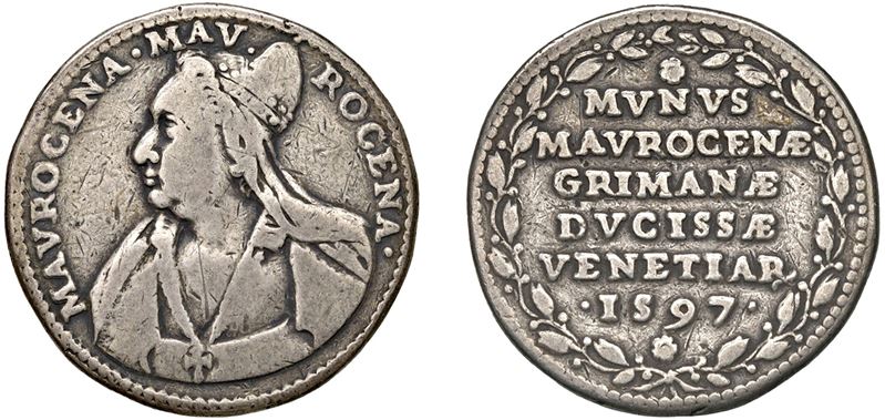 Obverse: Bust of the Dogaressa with the Doge's horn, facing left; - Reverse: Six-line inscription enclosed by a laurel wreath.