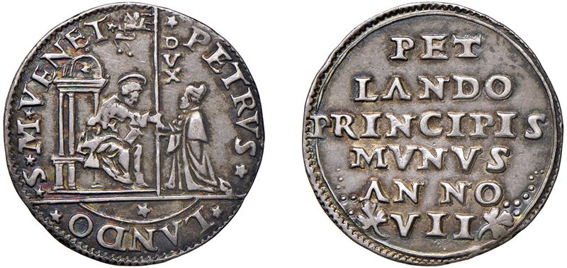 Obverse: St. Mark enthroned with a canopy, holding out the standard in his right hand to the kneeling Doge, who receives it with both hands. Along the shaft, DVX; - Reverse: Inscription in six lines.