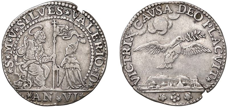 Obverse: Saint Mark seated on a throne presents the banner to the kneeling Doge, who receives it with his hand; - Reverse: A dove flies to the right, with an olive branch in its beak.
