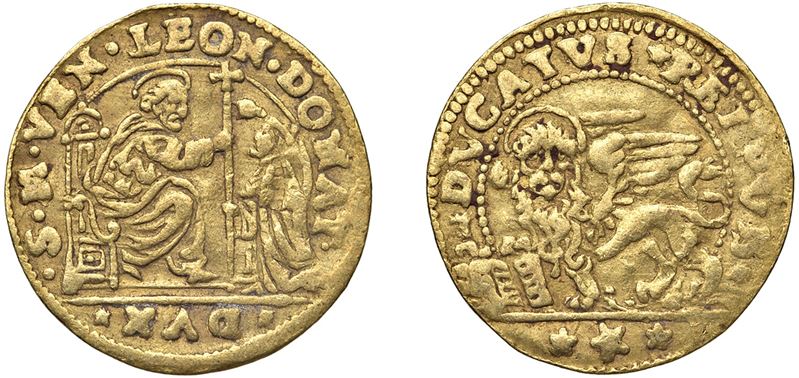 Obverse: Saint Mark seated in a chair offers the banner surmounted by a cross to the kneeling Doge, who takes it in his left hand; Reverse: Winged lion facing left, head facing forward, forepaw on an open book. A tower in the background.