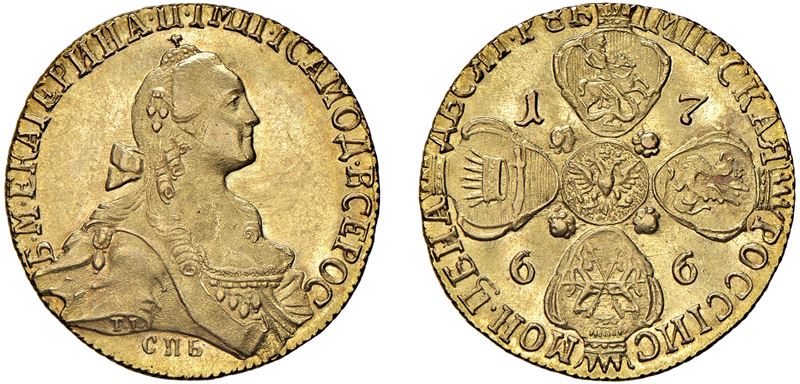 Obverse: Bust of Catherine II right; Reverse: Cross formed by four crowned shields with a double-headed eagle in the center.