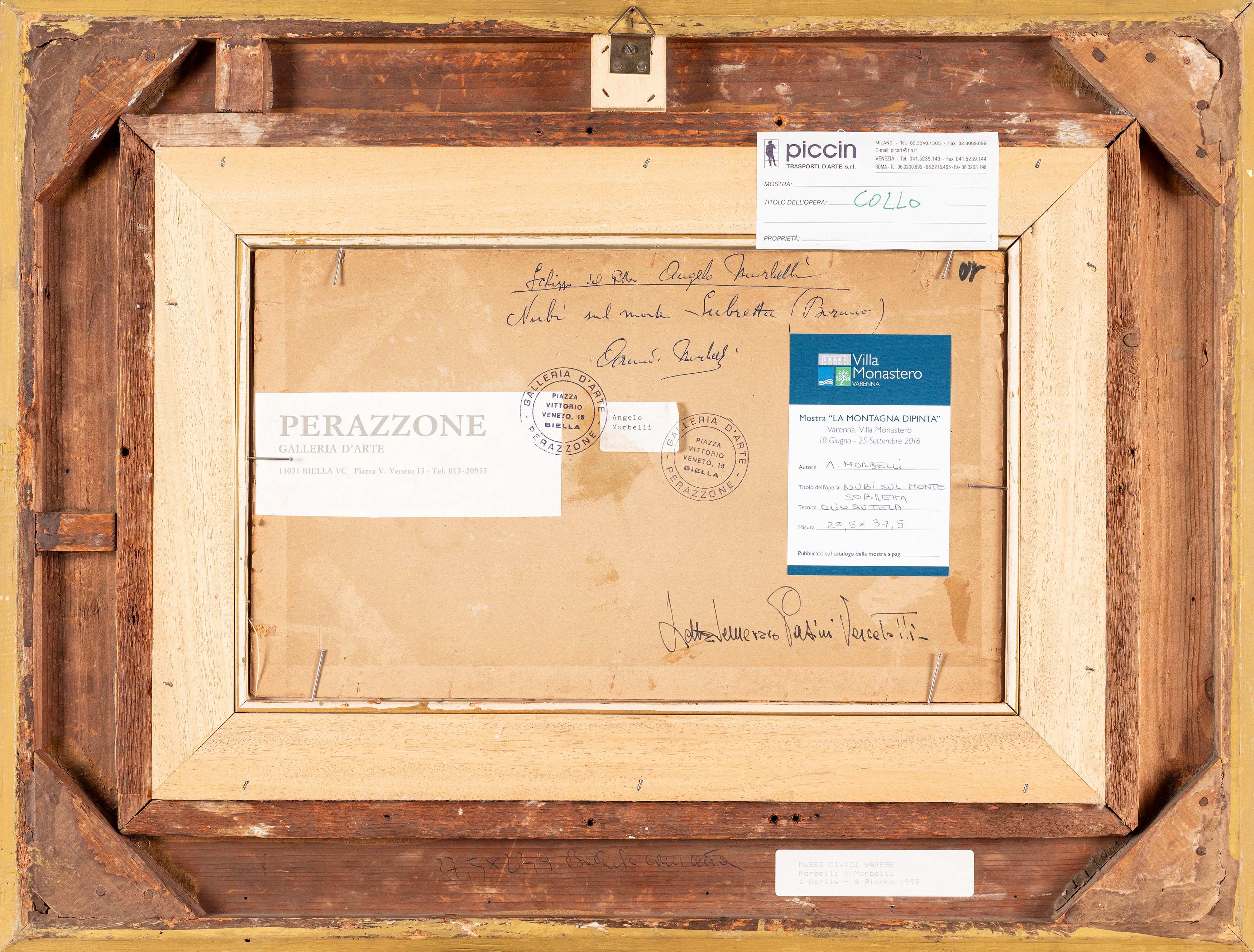 on the back, label of the exhibition La montagna dipinto , Varenna, Villa Monastero (18 June-25 September 2016); another label of the exhibition Morbelli&Morbelli , Varese, Musei Civici (1 April-4 June 1995); stamps and labels of the Galleria d'Arte Perazzone of Biella