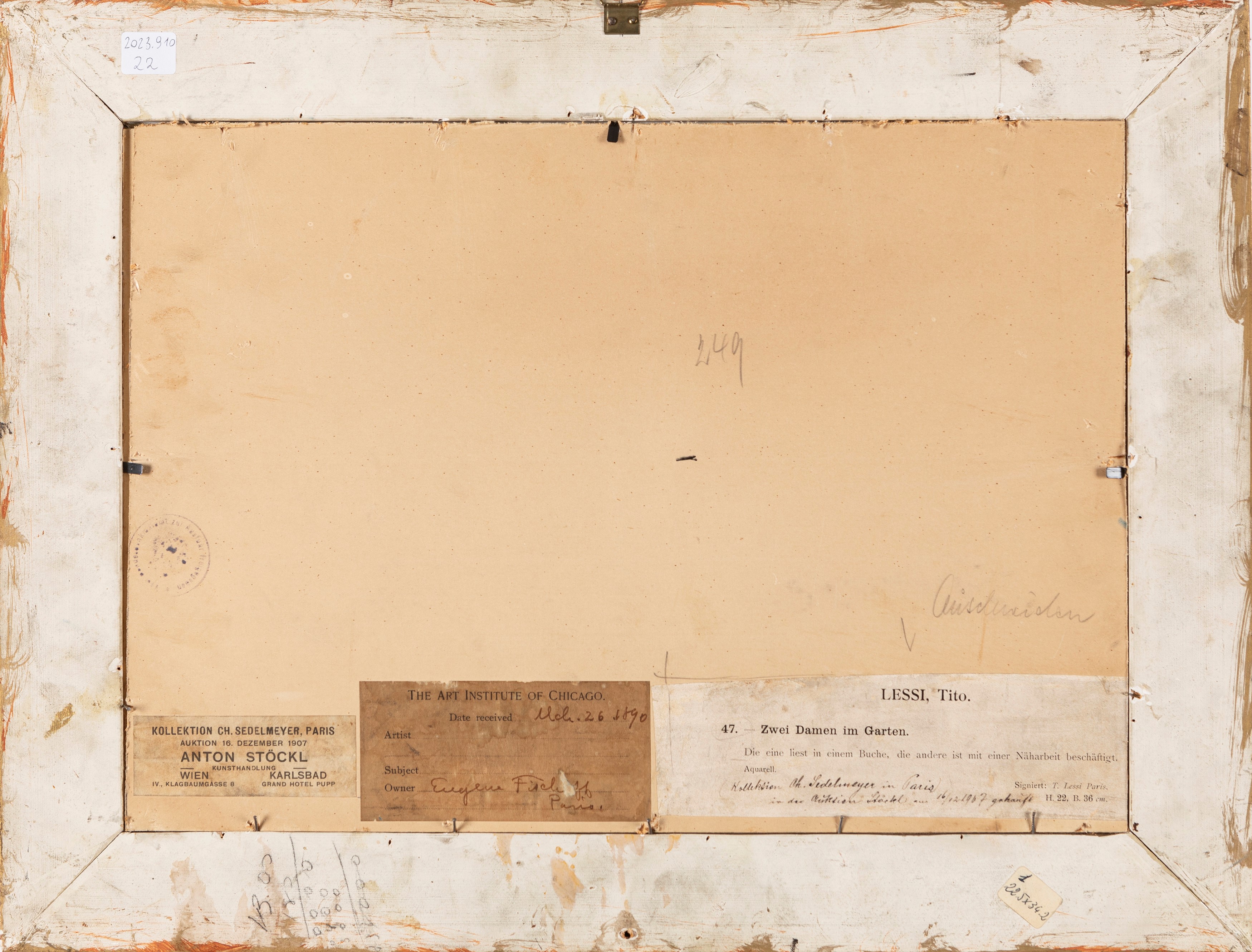 on the back, on the closing card, label of provenance (Sedelmeyer collection, Paris, 1907), label of the Art Institute of Chicago (1890) and exhibition label