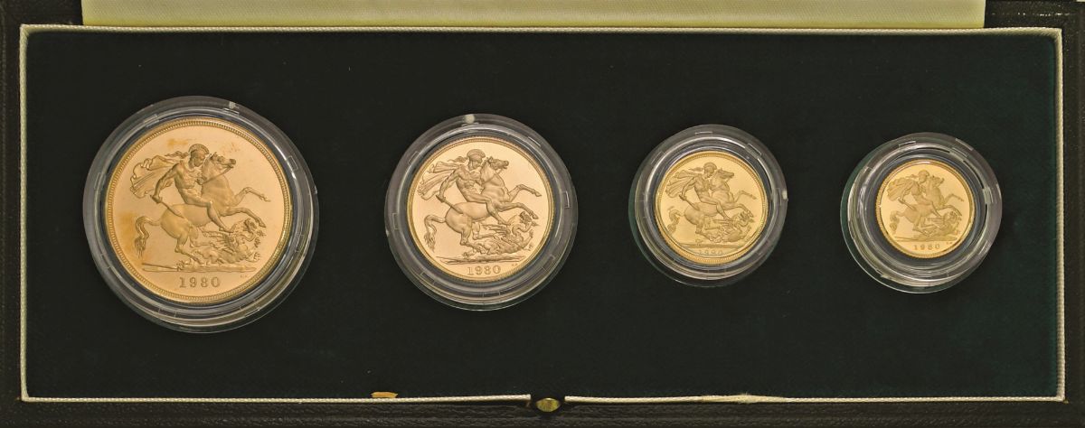 Serie di 4 valori in ORO 1980 (5 e 2 pounds, sterlina e mezza sterlina), tot. gr. 67,84. In astuccio.