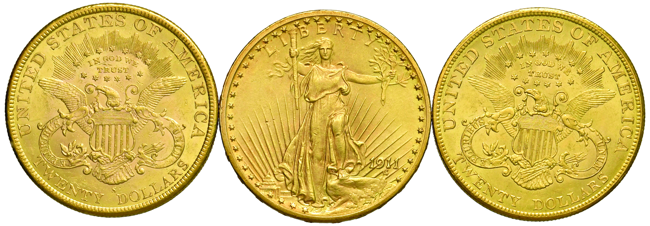 20 dollari 1895, 1904 e 1911. Lotto di 3 monete. ORO, gr. 100.