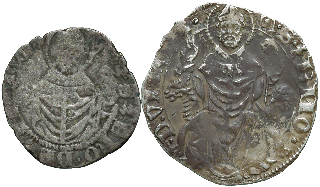 Grosso o pegione,con croce fiorata, e S.Zeno seduto di fronte. MIR 323. AG. Molto raro. BB