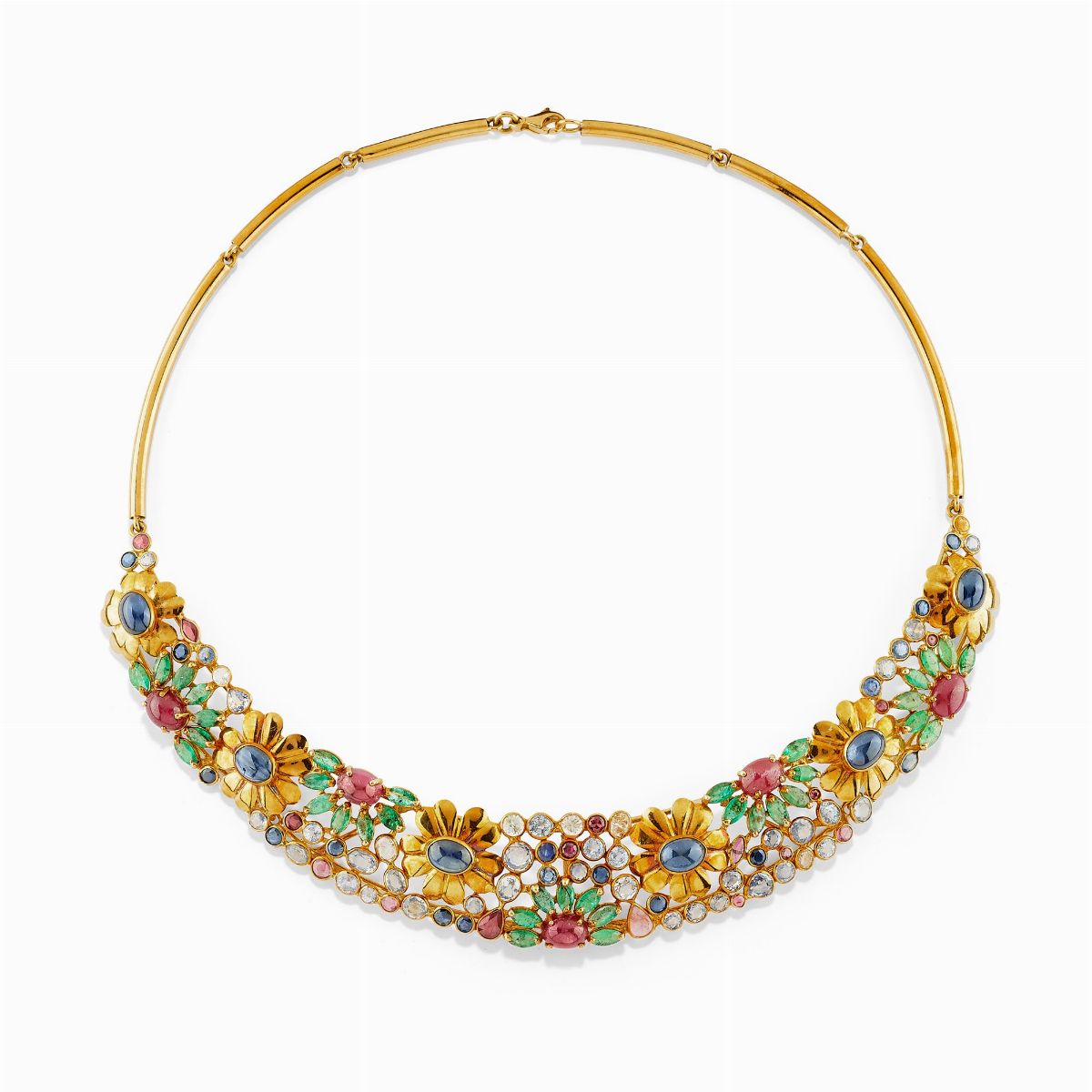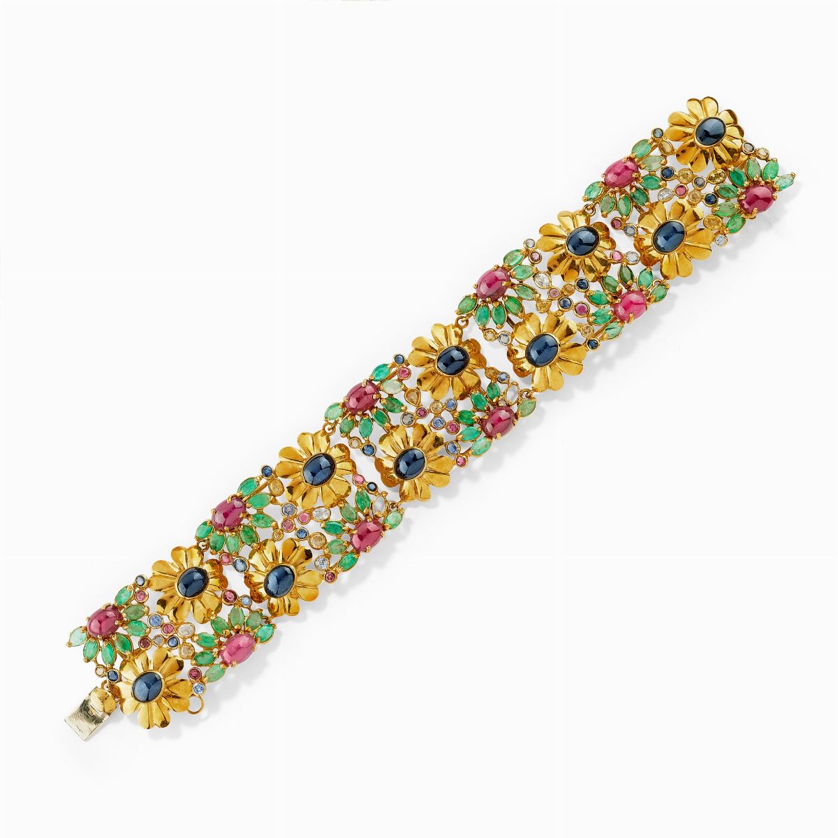 A 18K yellow gold, emerald, ruby, sapphire, colored and uncolored gemstone demi parure