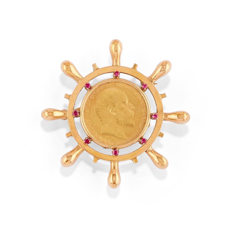 18 and 22k yellow goldwith Edward VII coin in the centre, surrounded by round cut synthetic rubies
