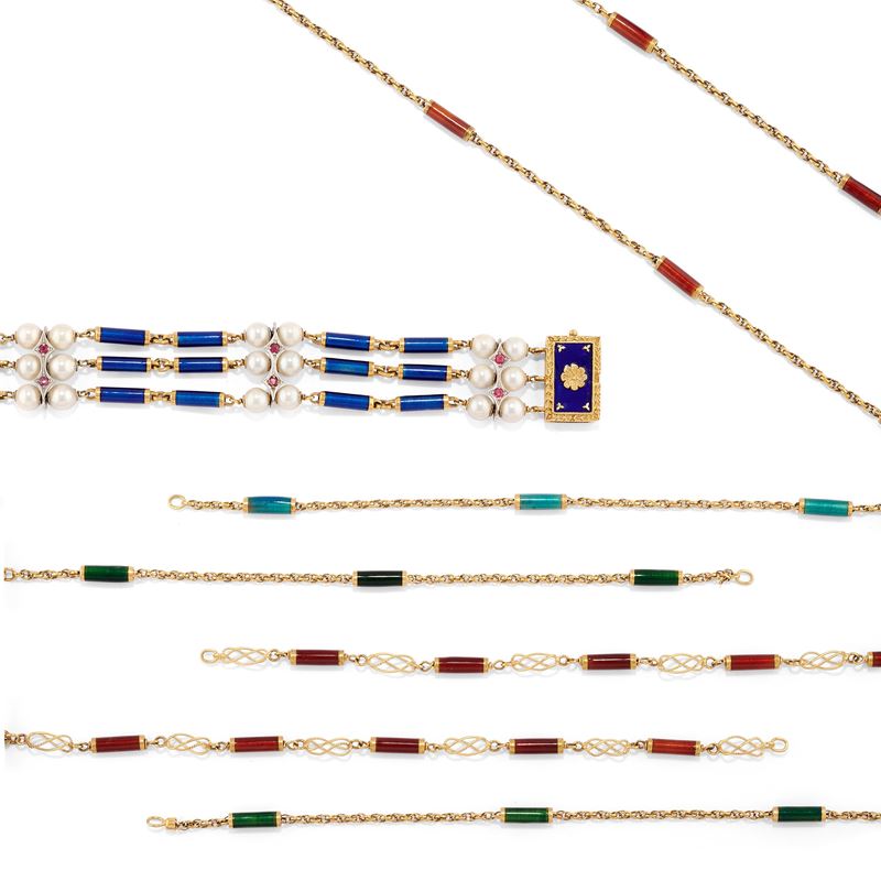 consisting of six bracelets and a necklace with cylindrical sections decorated with polychrome enamels, one with cultured pearls and rubies