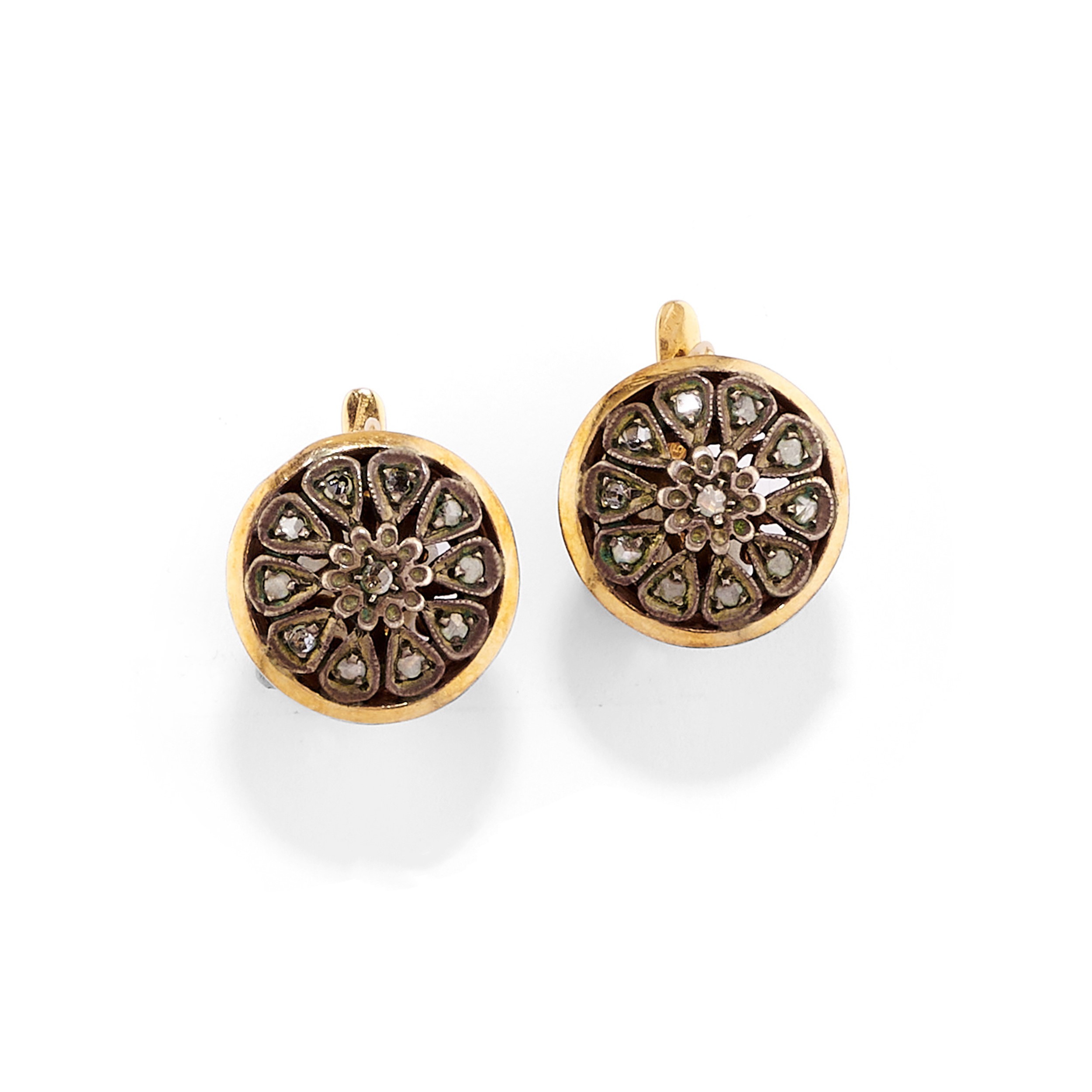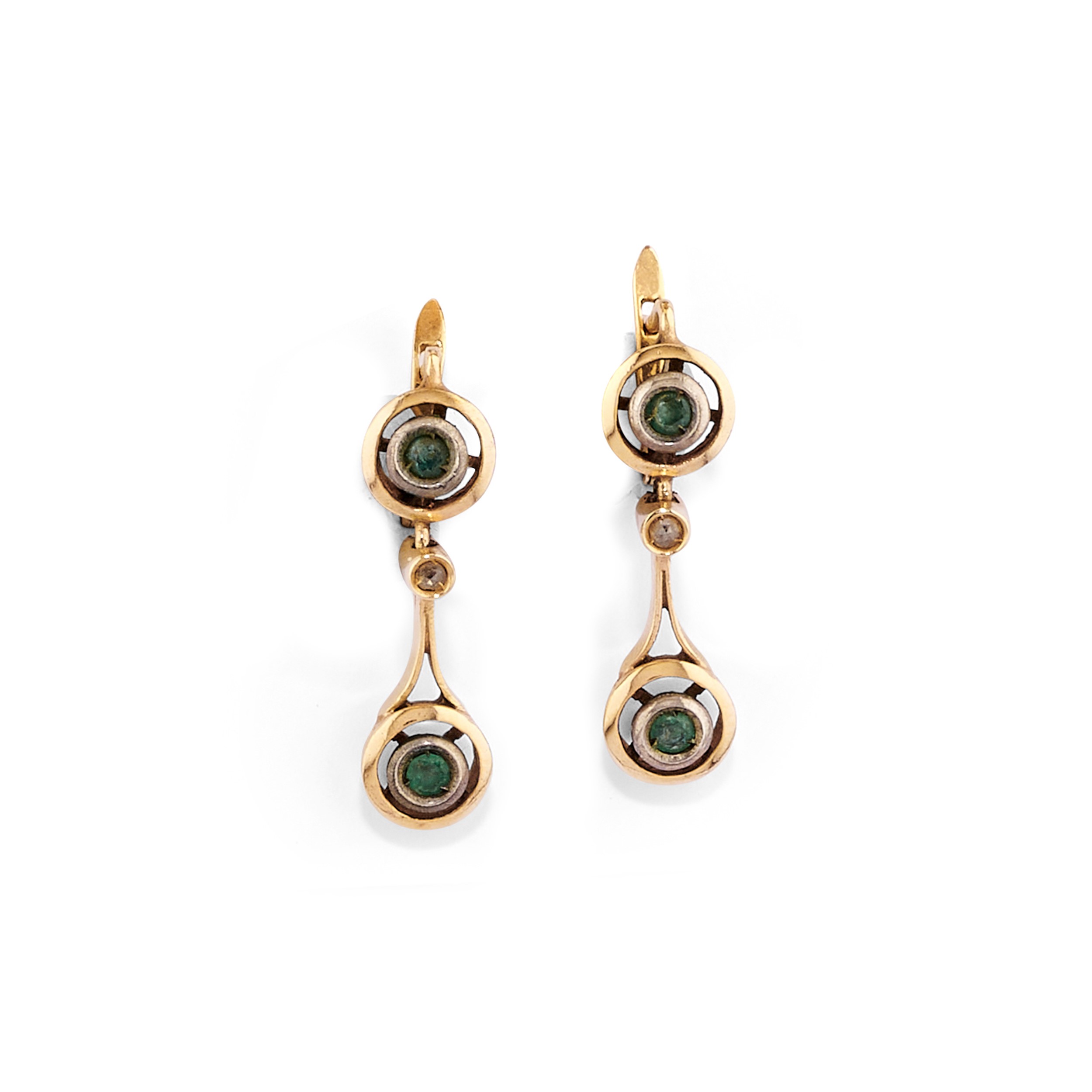 12k yellow gold and silverone with rose cut diamonds, the other with round cut emeralds and rose cut diamonds, pin and clip fastenings