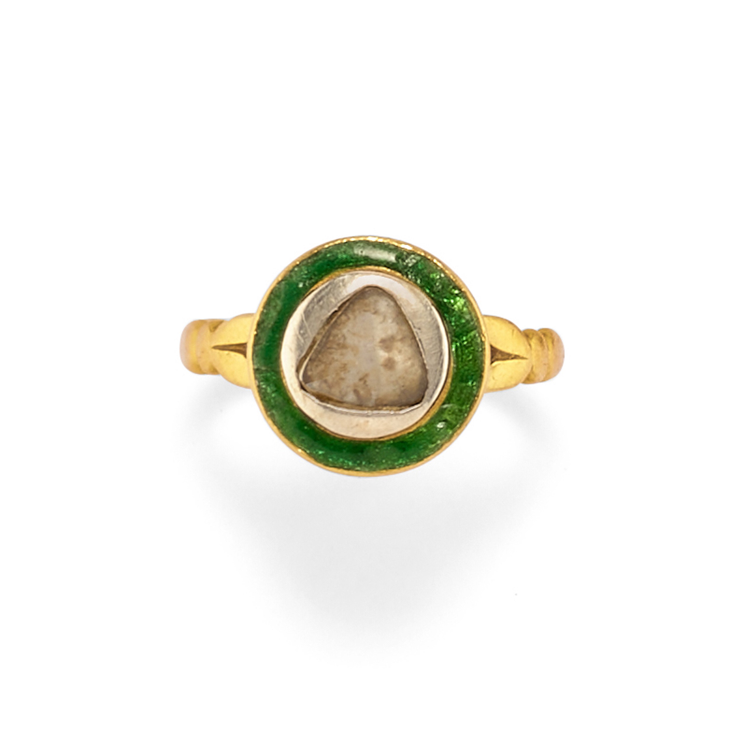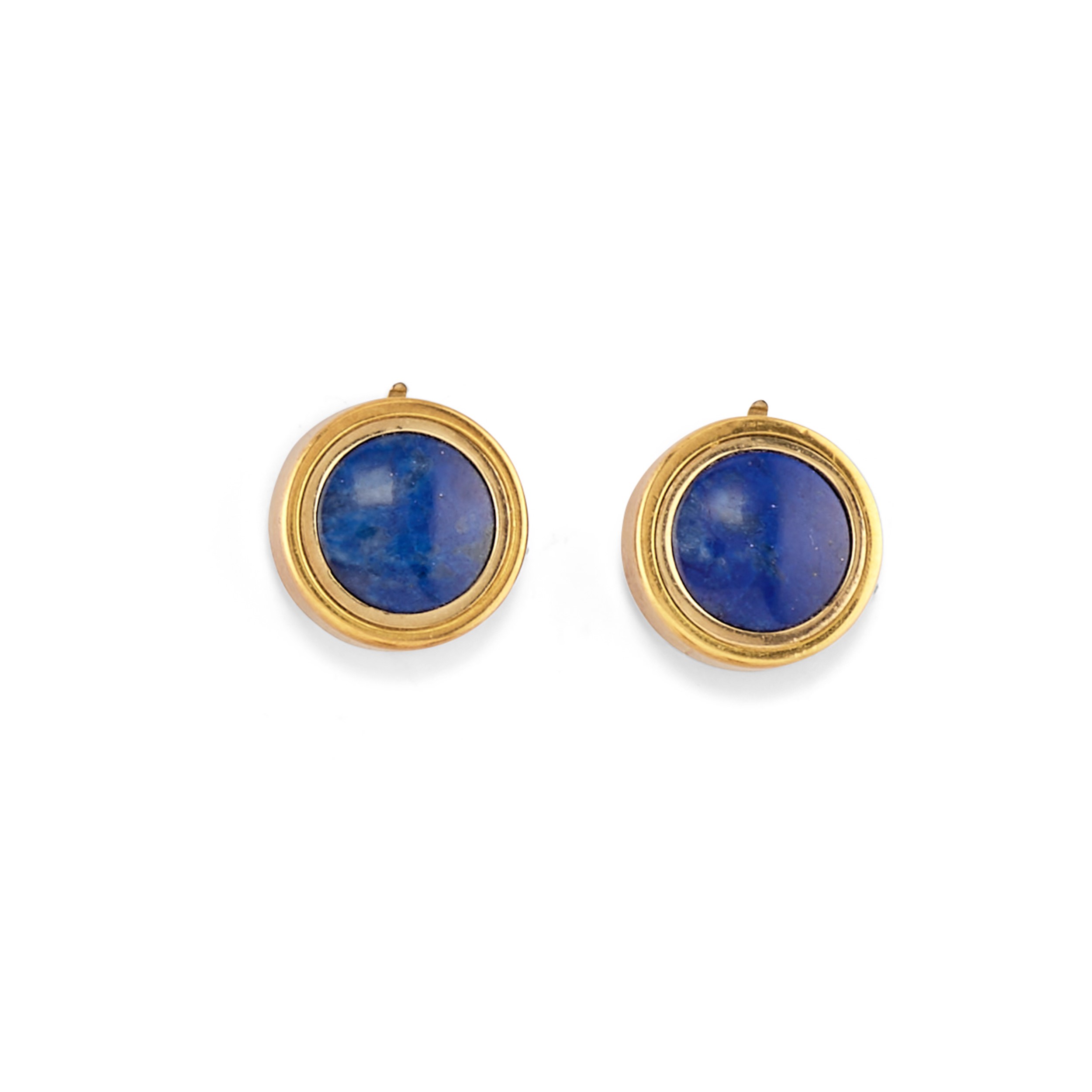 consisting of two blue enamel button covers, an Indian-style ring and a pair of earrings, fitted with posts.