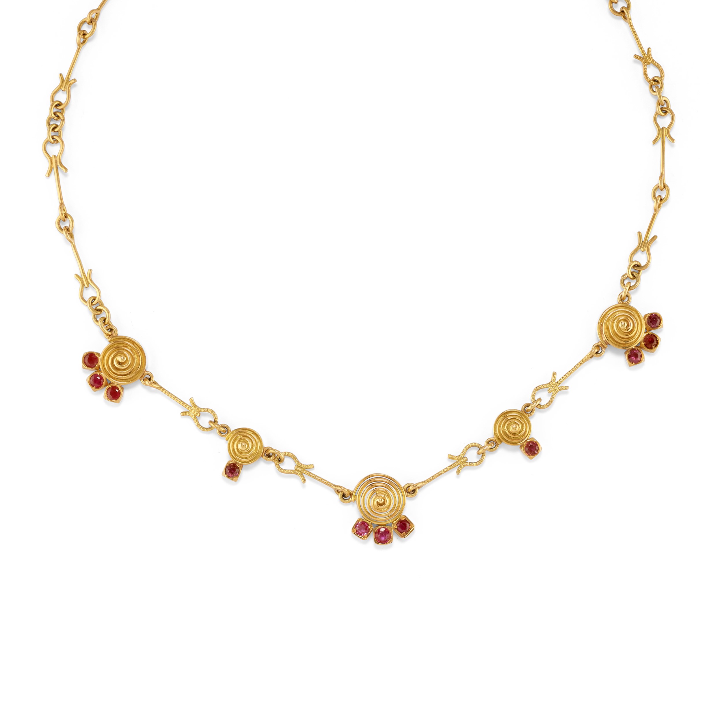 18k yellow goldnecklace and pendant, with spiral motifs and round-cut rubies.