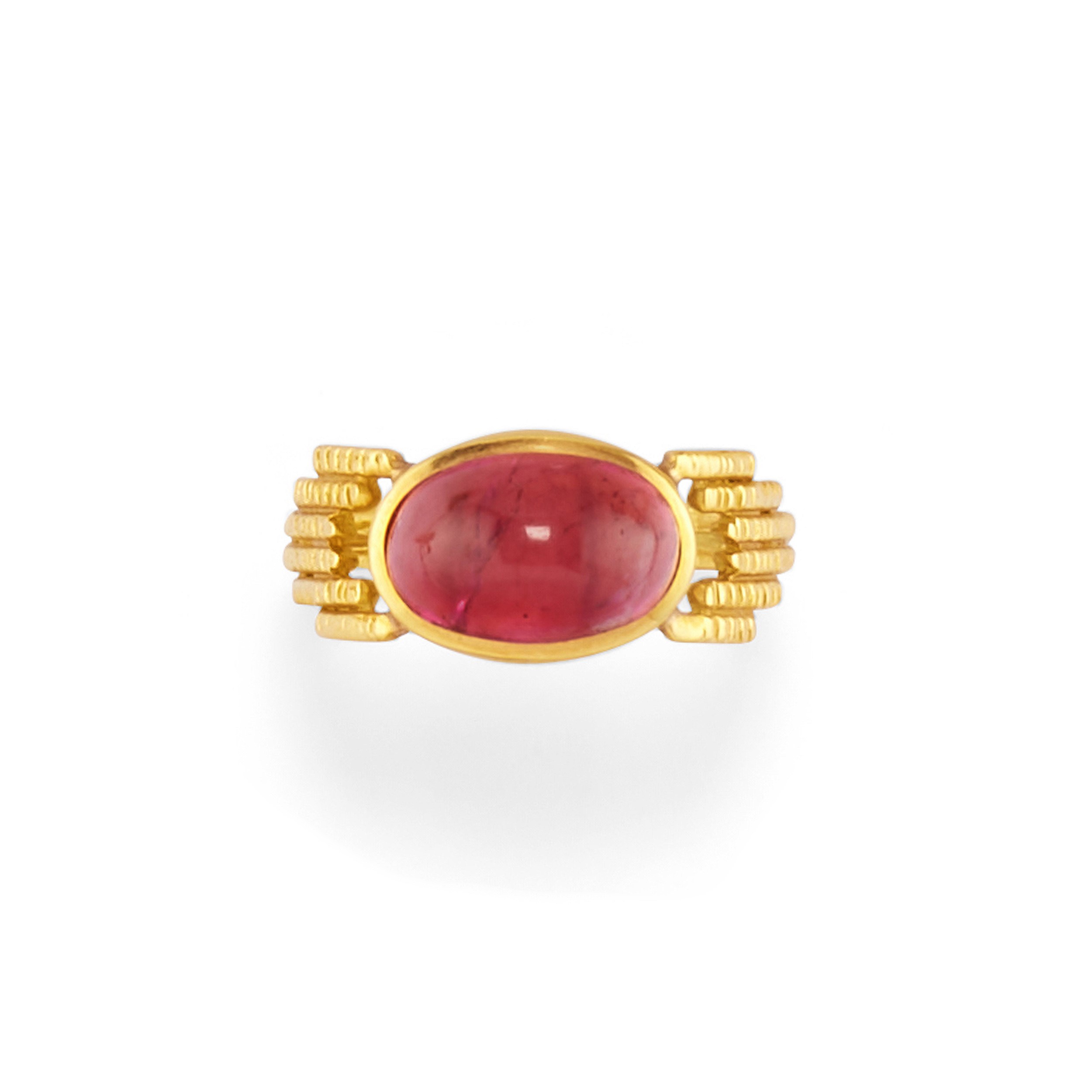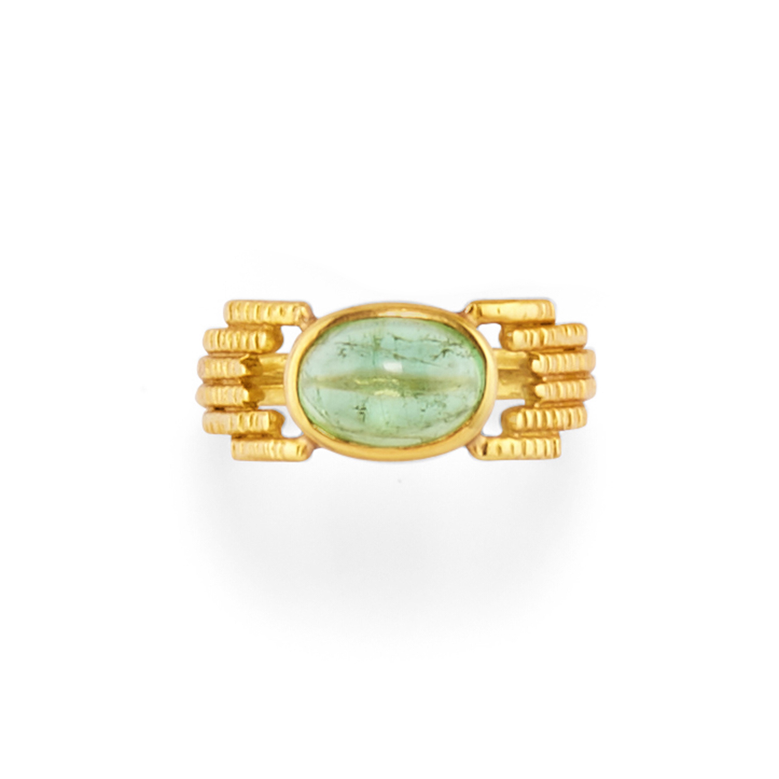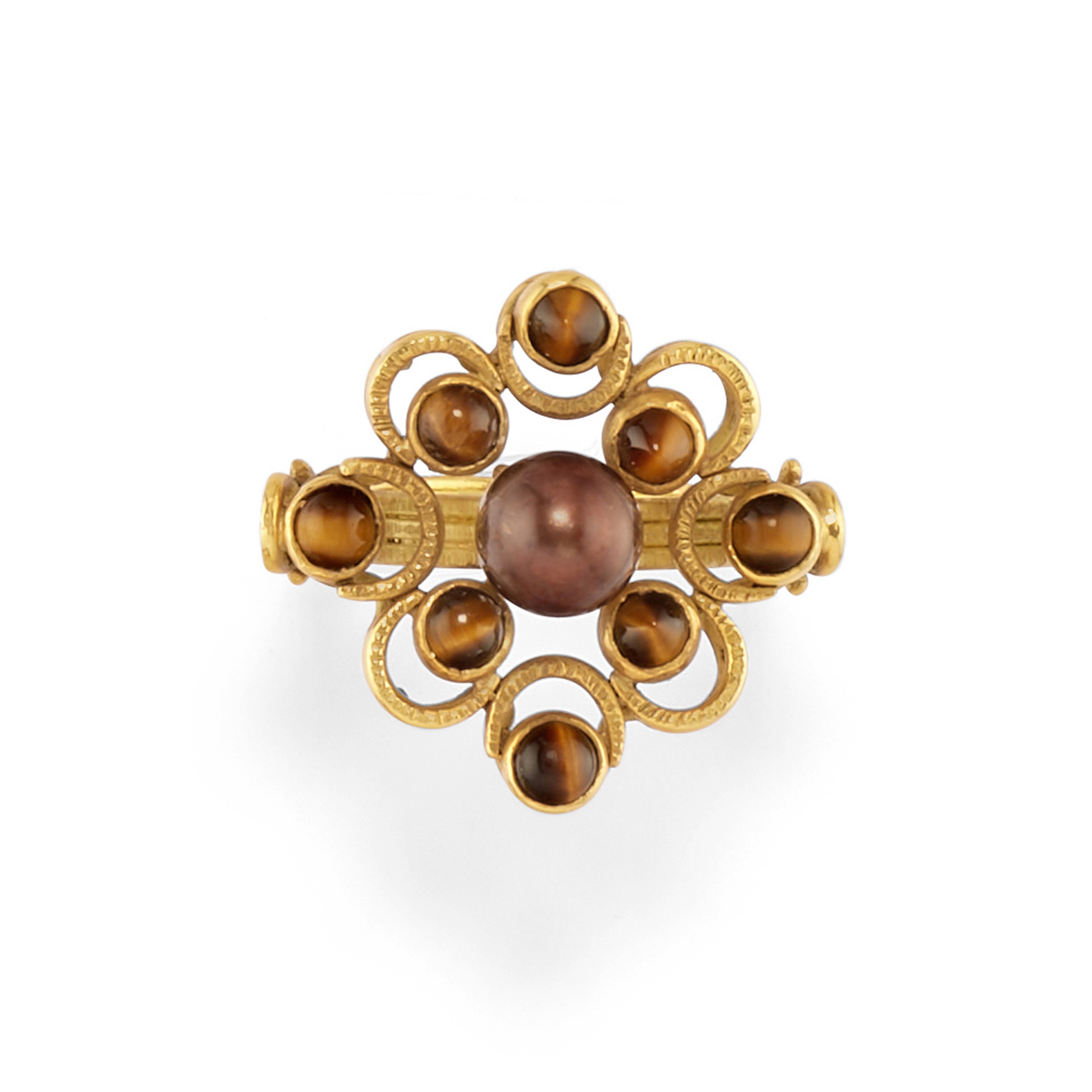 18k yellow goldof various shapes and depictions, with hammered gold decoration, round-cut tiger eye cabochon, oval-cut green and pink tourmaline cabochon and chocolate cultured pearl.