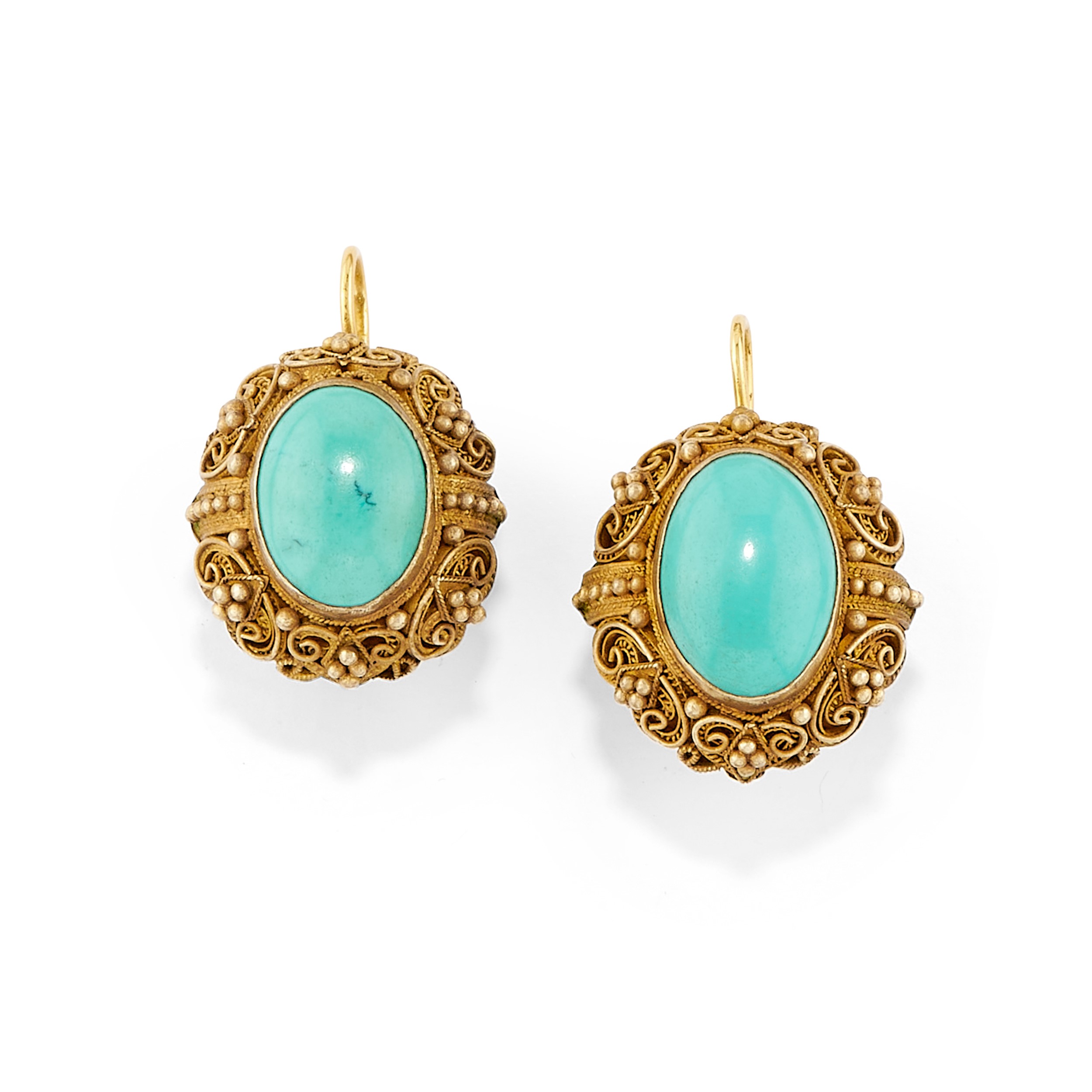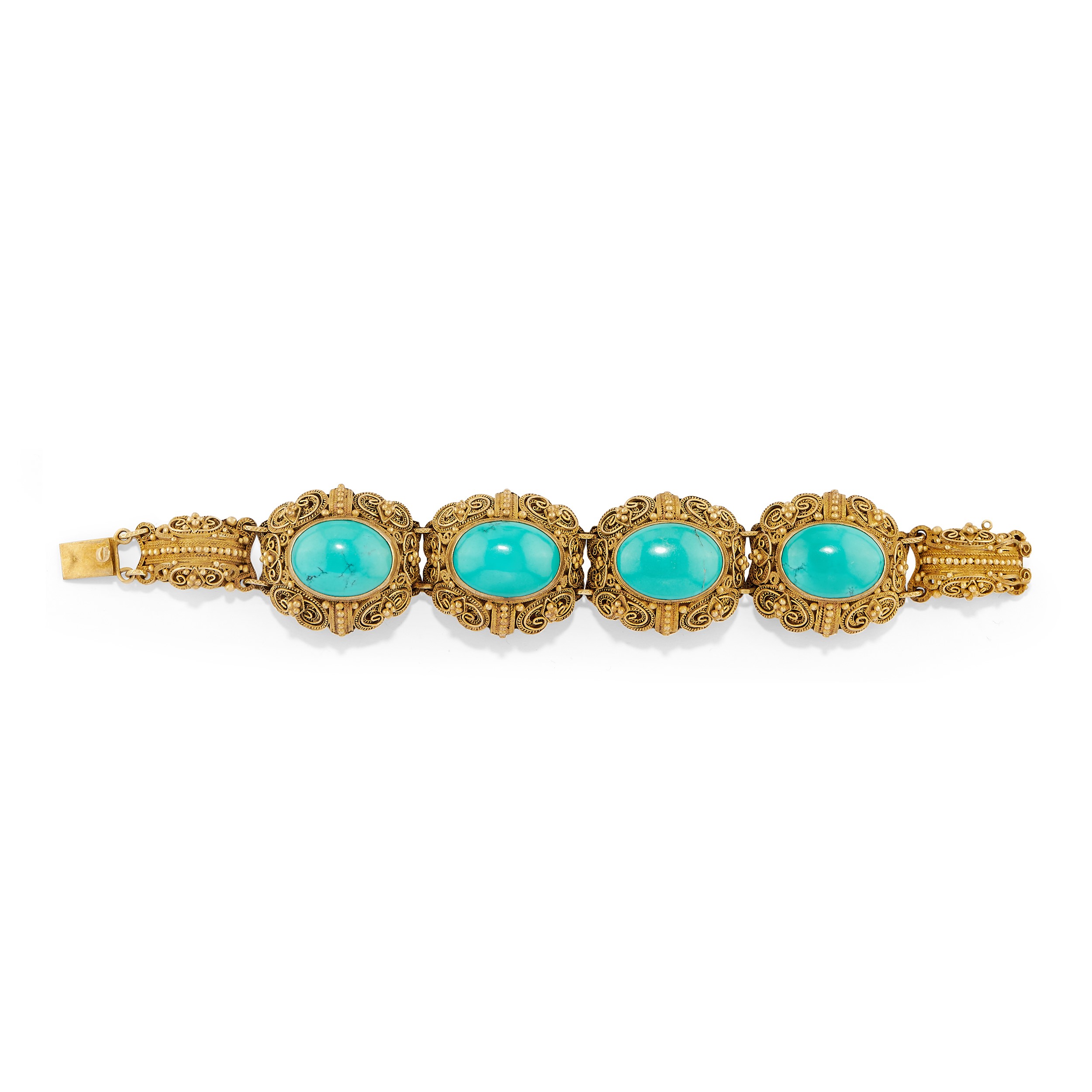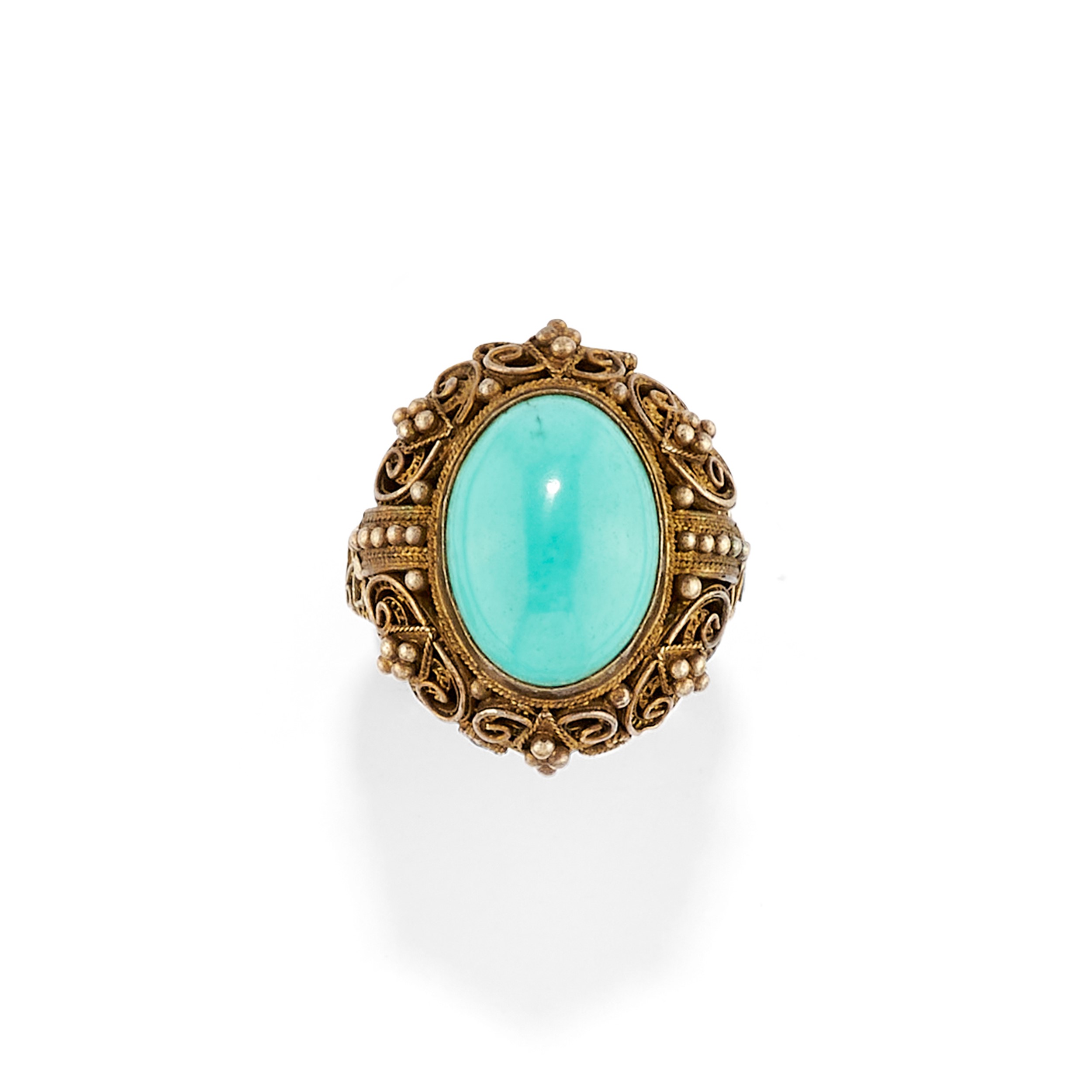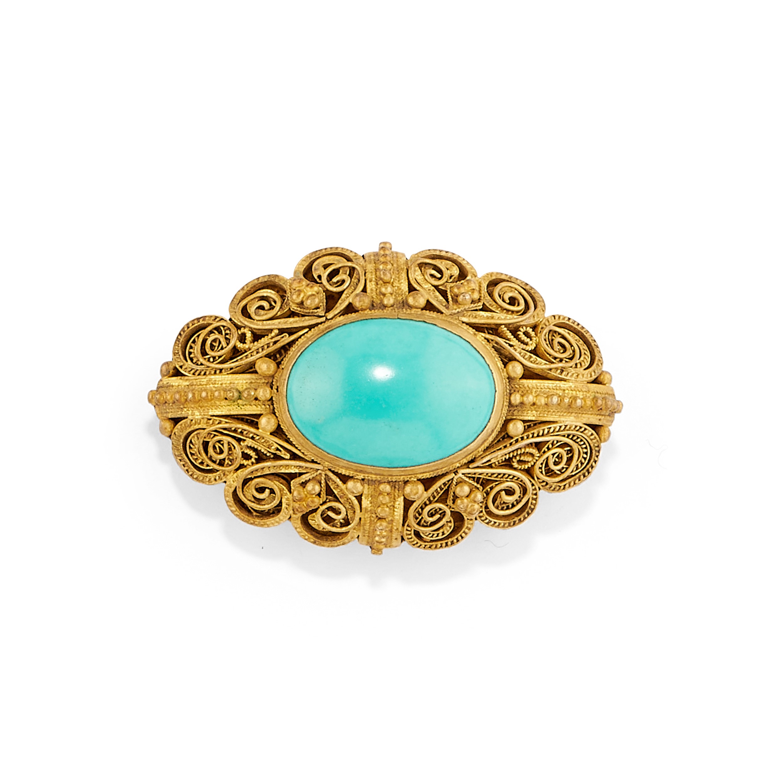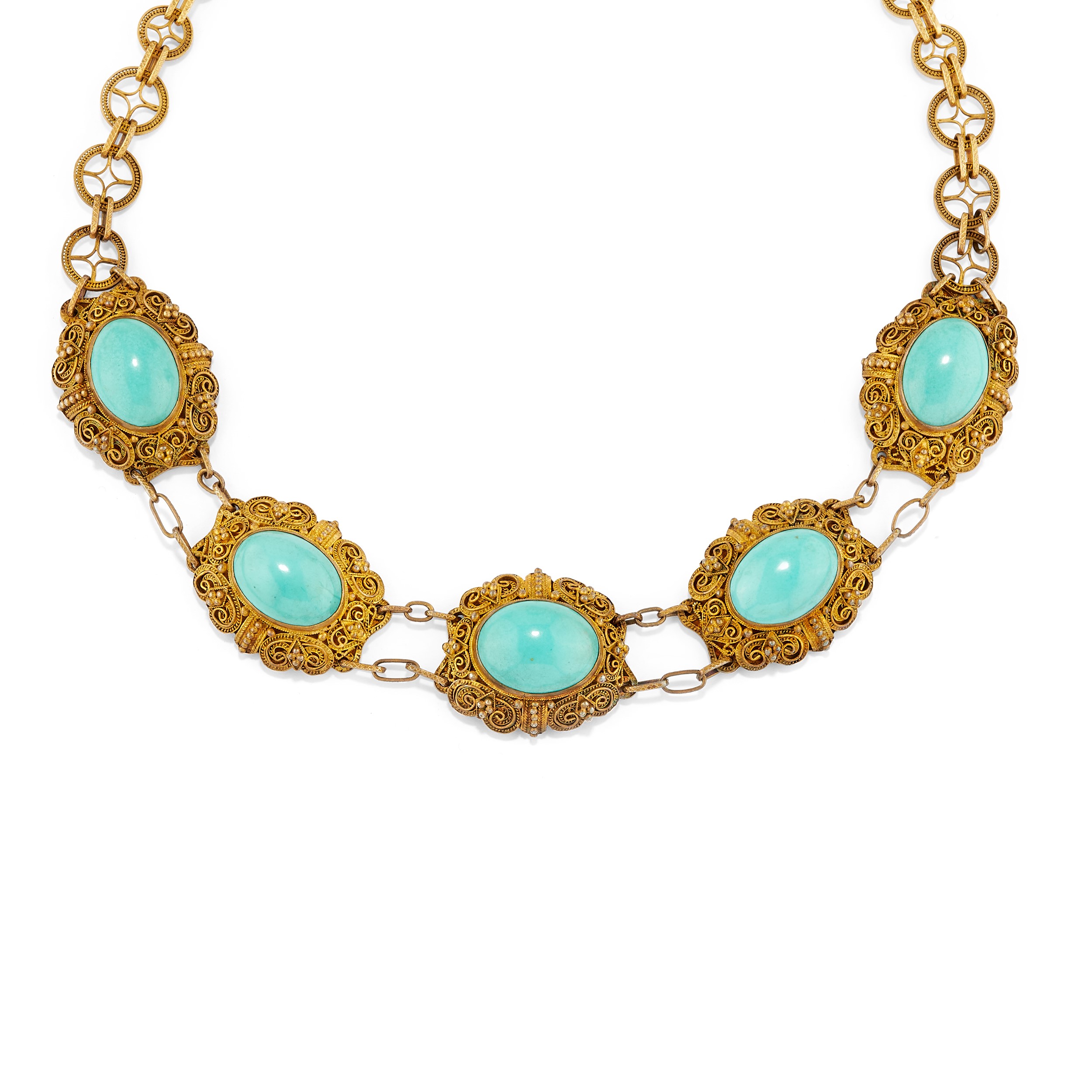 filigree work with oval-cut cabochon turquoise, consisting of necklace, bracelet, brooch, ring, and pair of earrings with clasp closure.