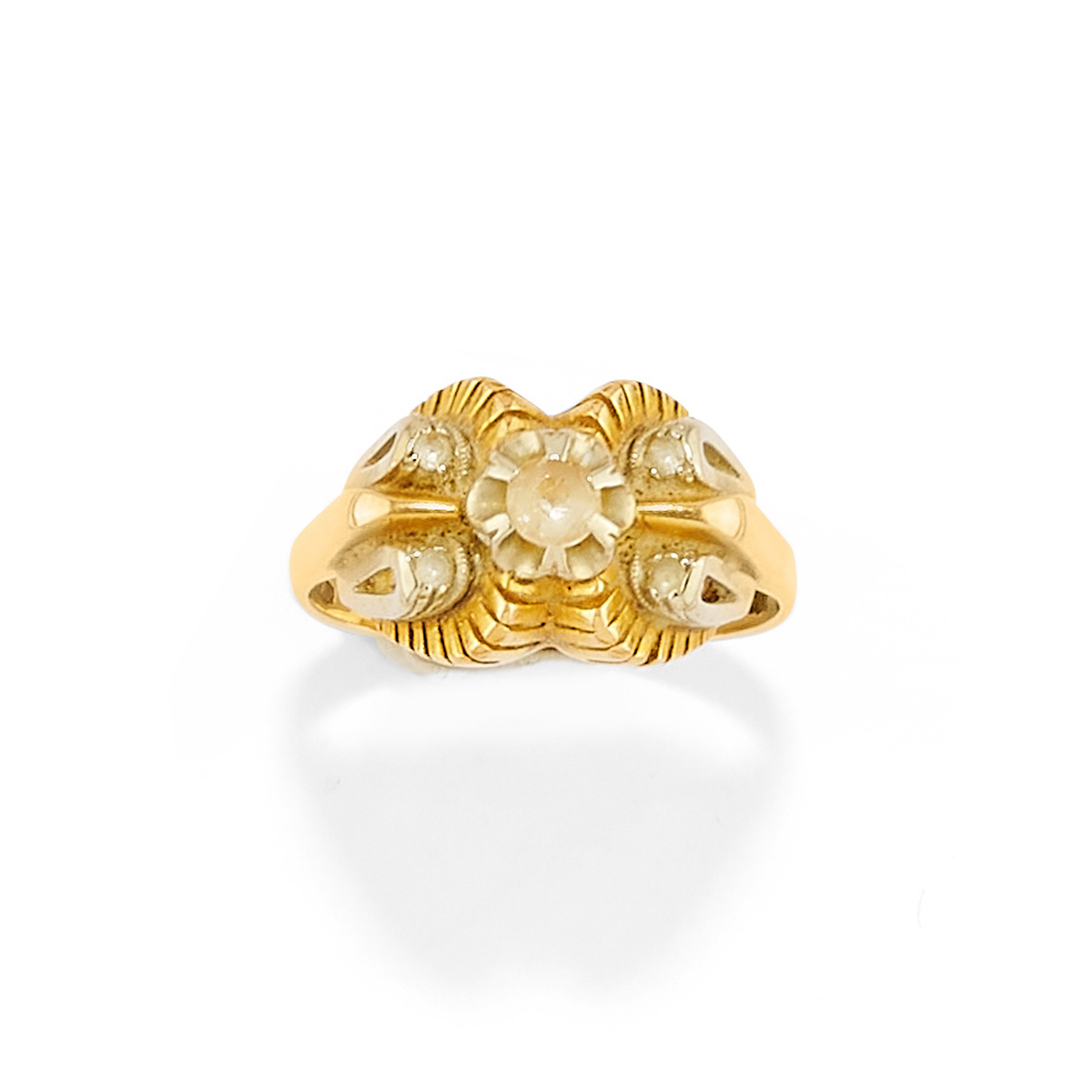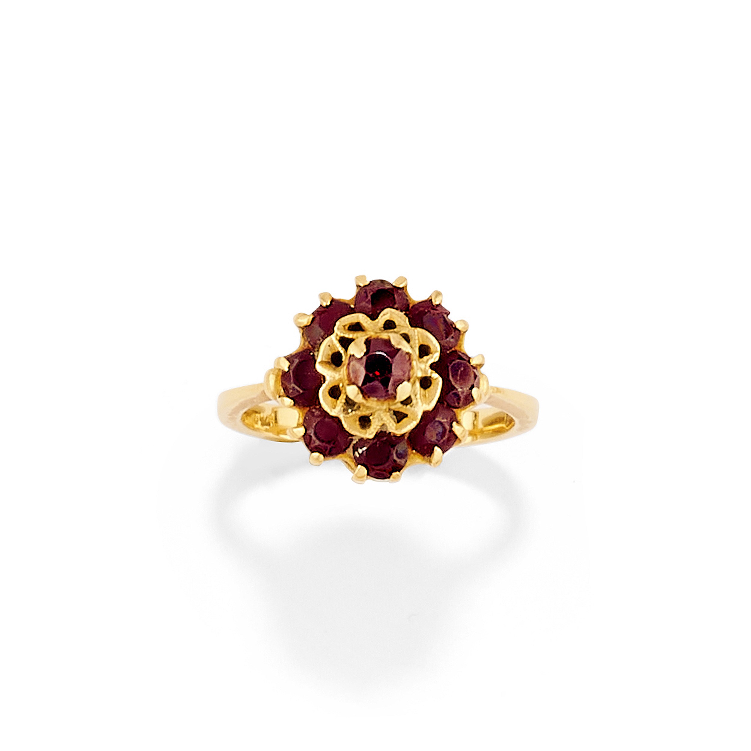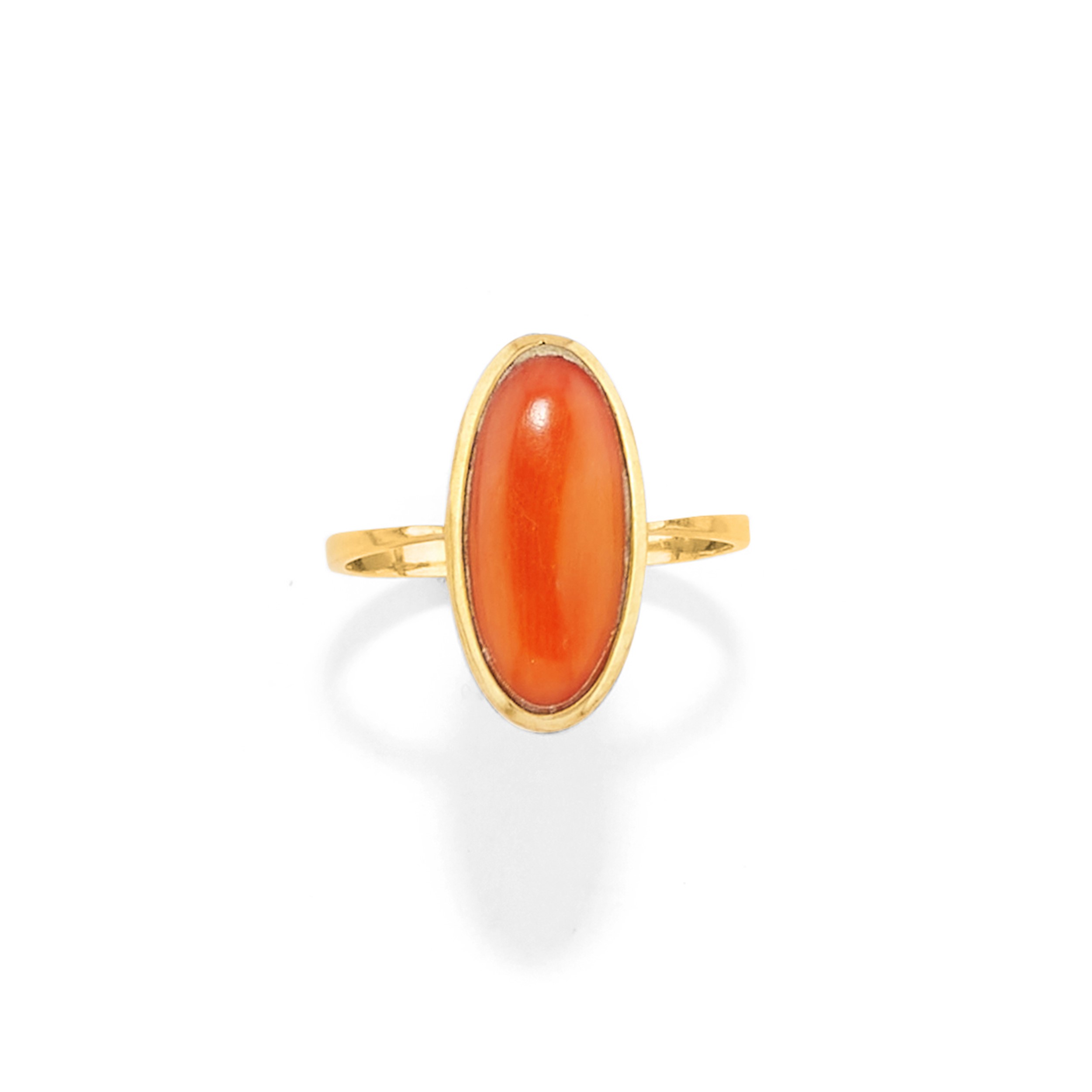 18k yellow goldone with oval-cut cabochon coral, one with colorless stones imitating diamond, one with round-cut garnets.