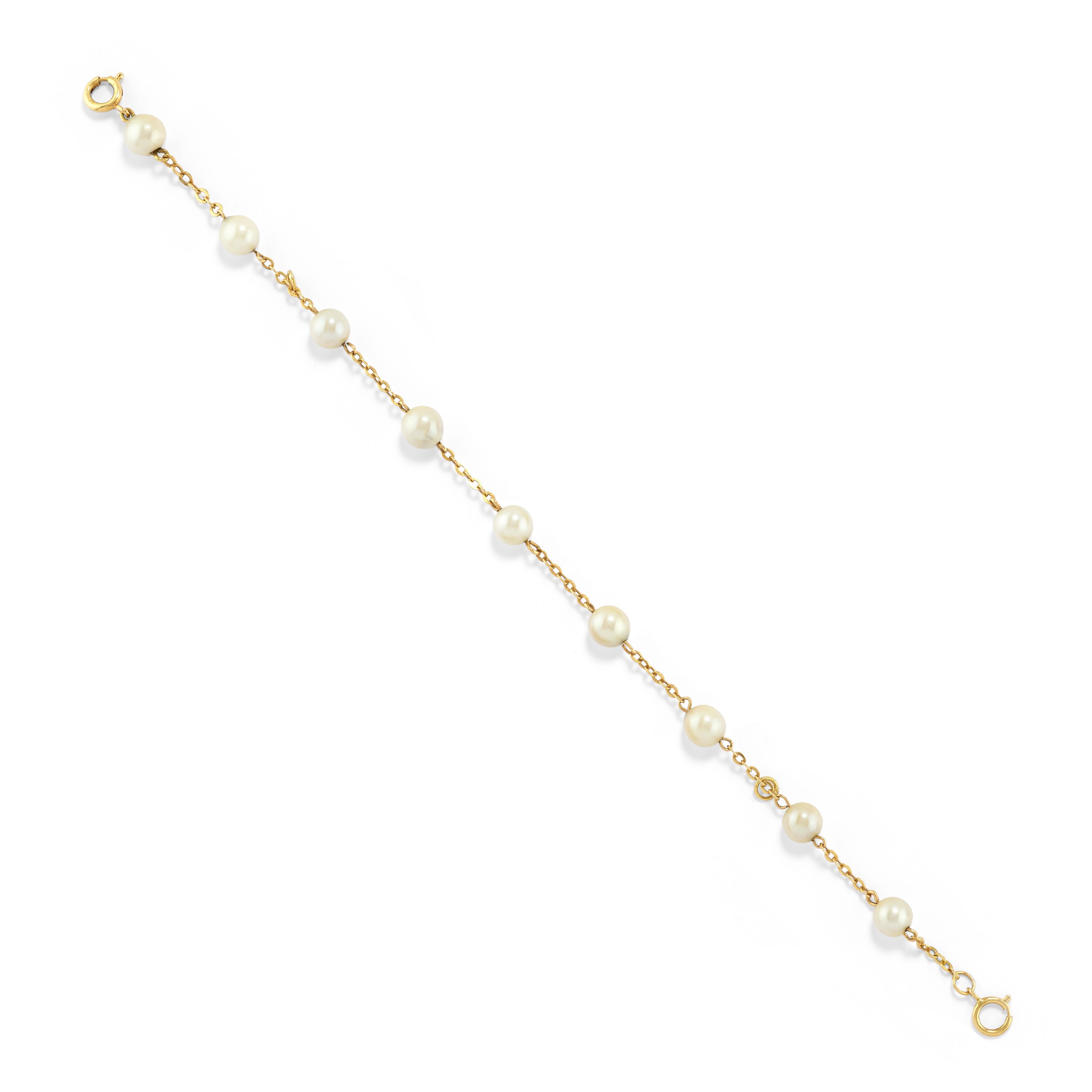 18k yellow goldone made with five circles and heart pendant, one with mm 6,00 cultured pearls, defects (dents on the first bracelet).