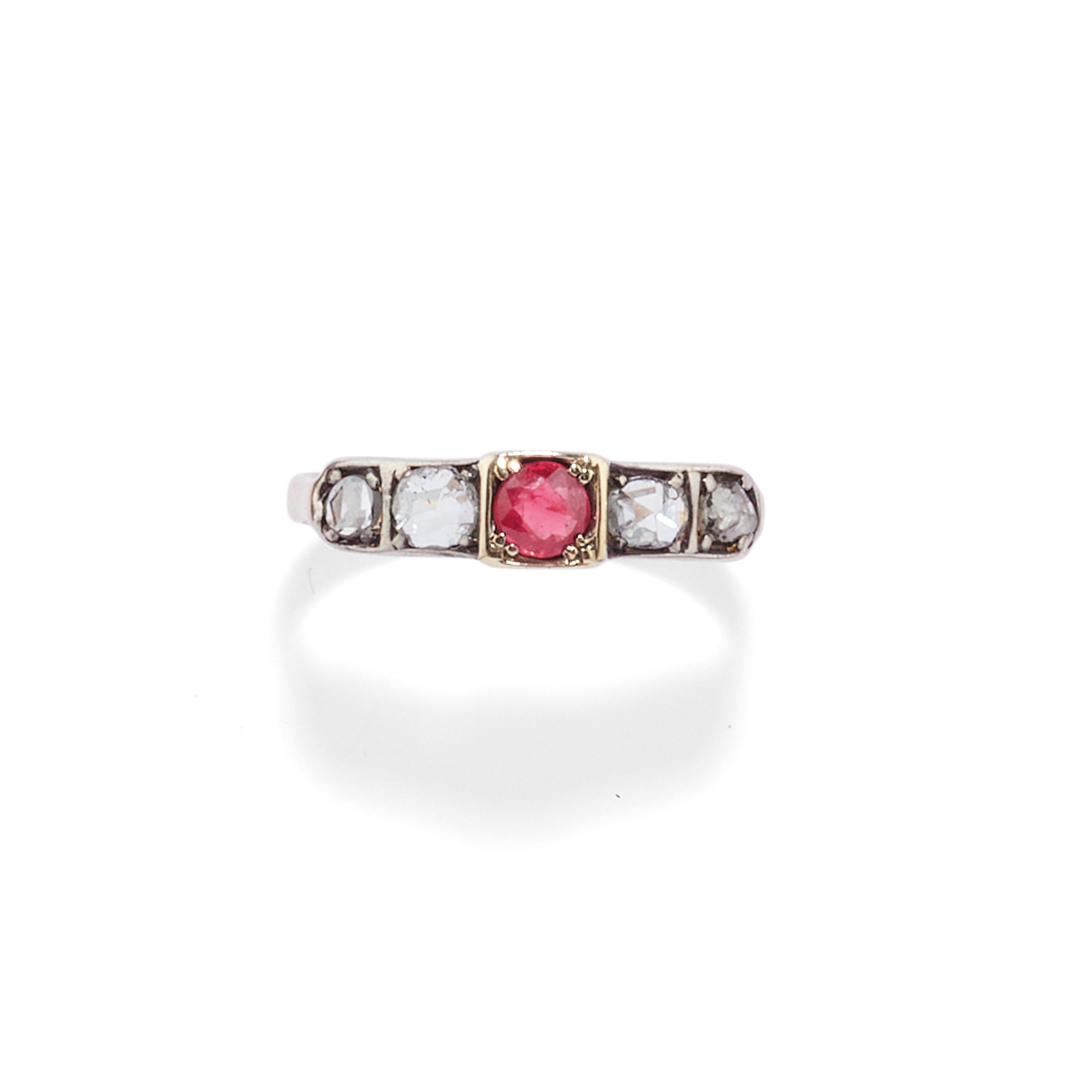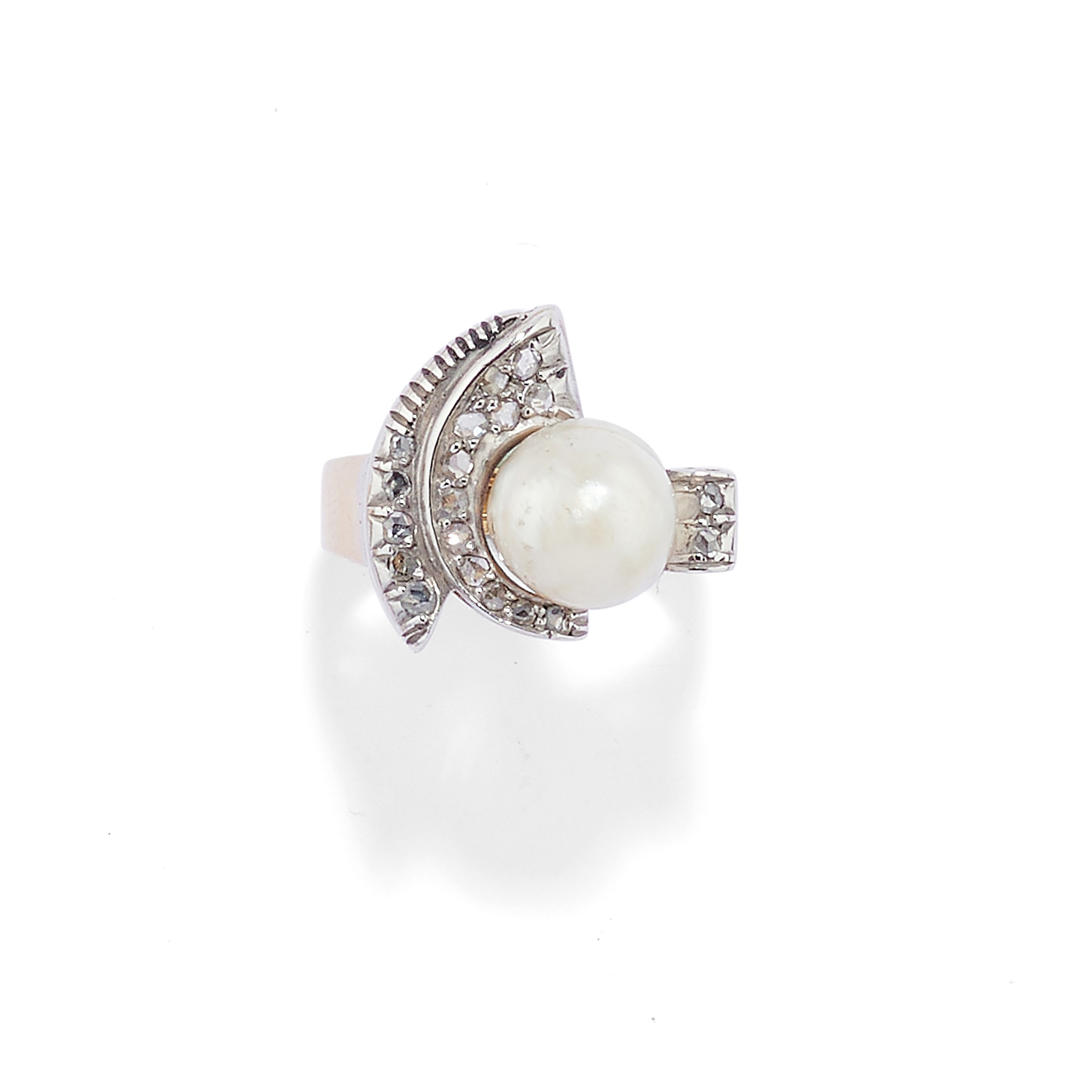 of different shapes and sizes, decorated with old and rose-cut diamonds, a round-cut ruby and a pearl measuring approx. mm 9,00.