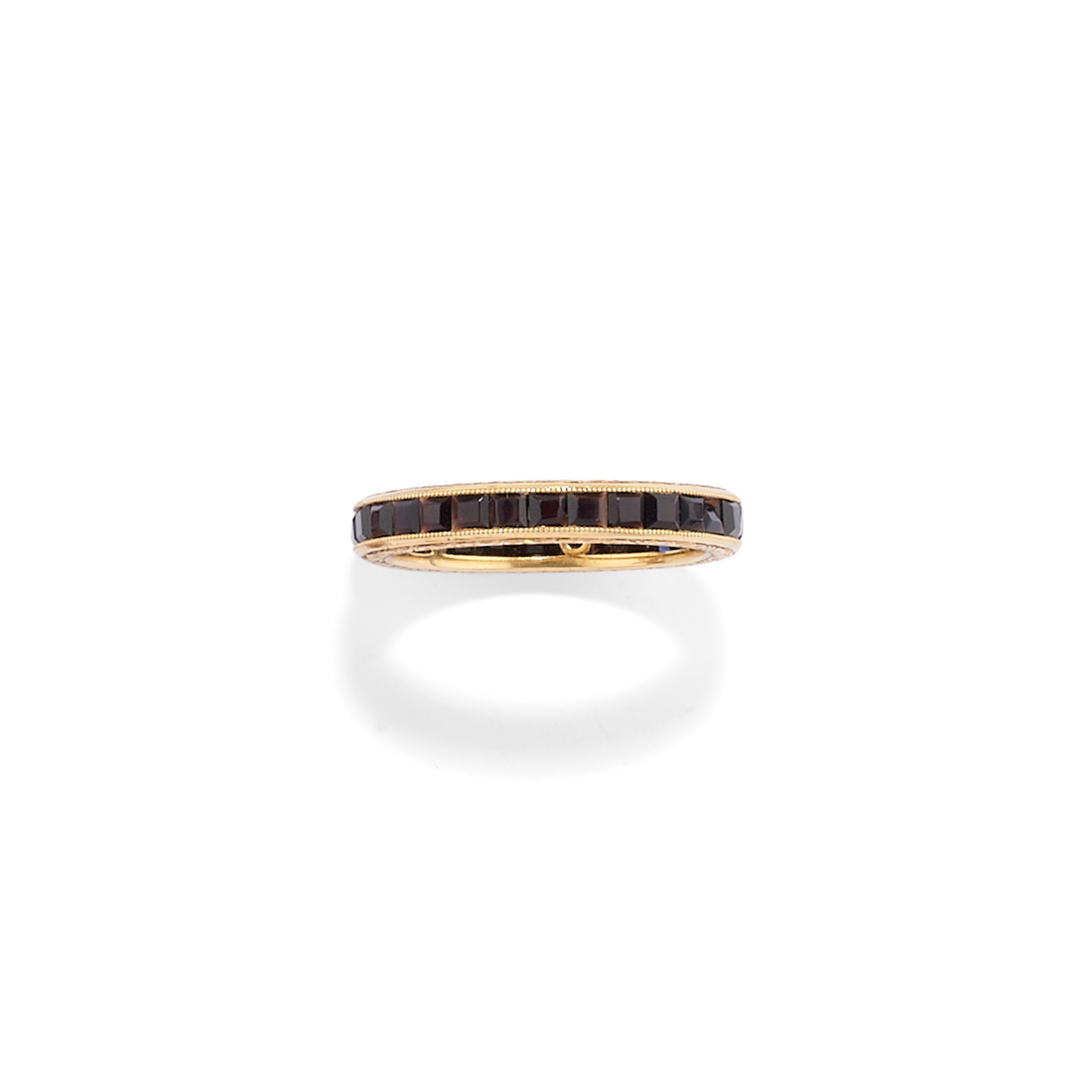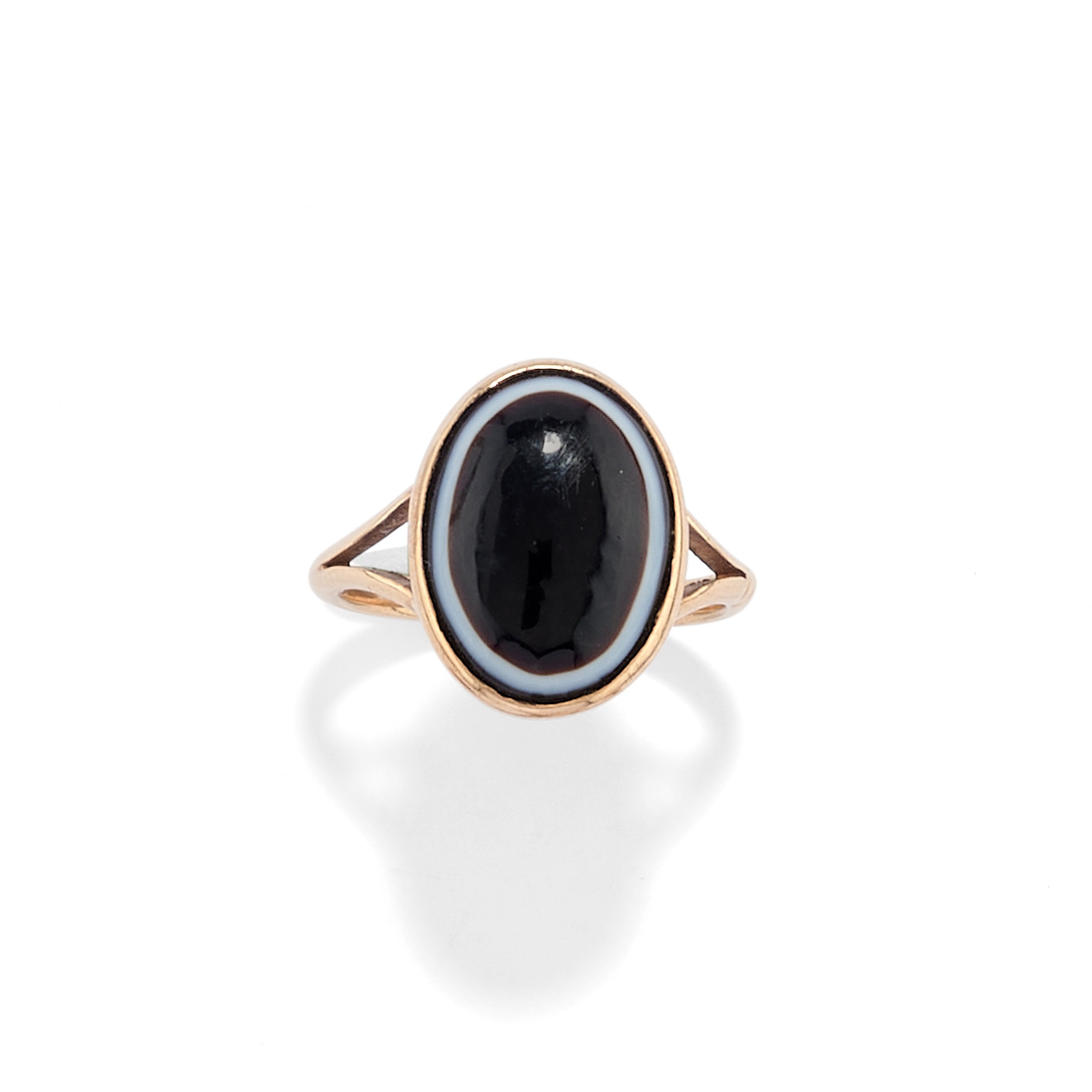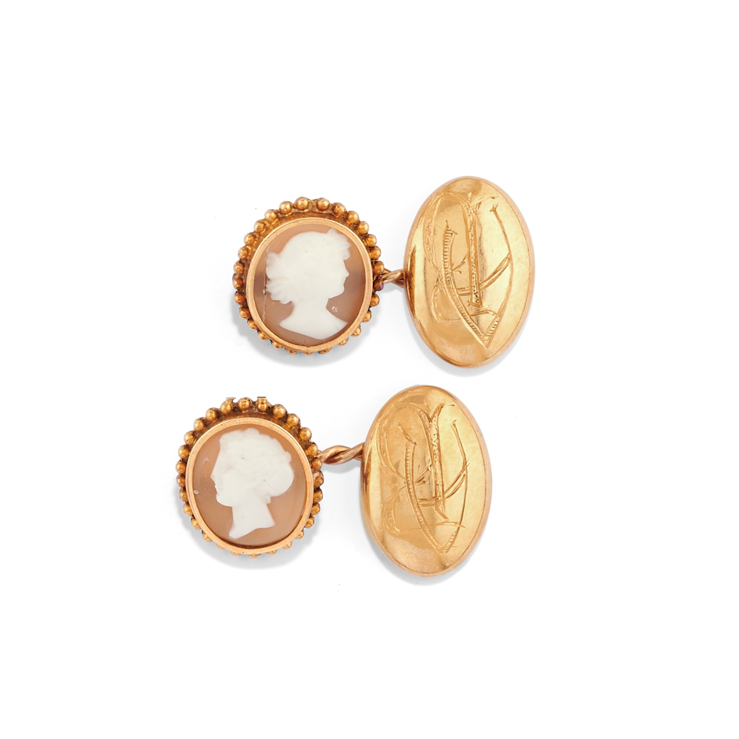 18k and low carat goldconsisting of a ring with agate, a pair of cuffs with cameos, a pin with cameo, a rivière ring with hardstones and a brooch with ski and ice axe.