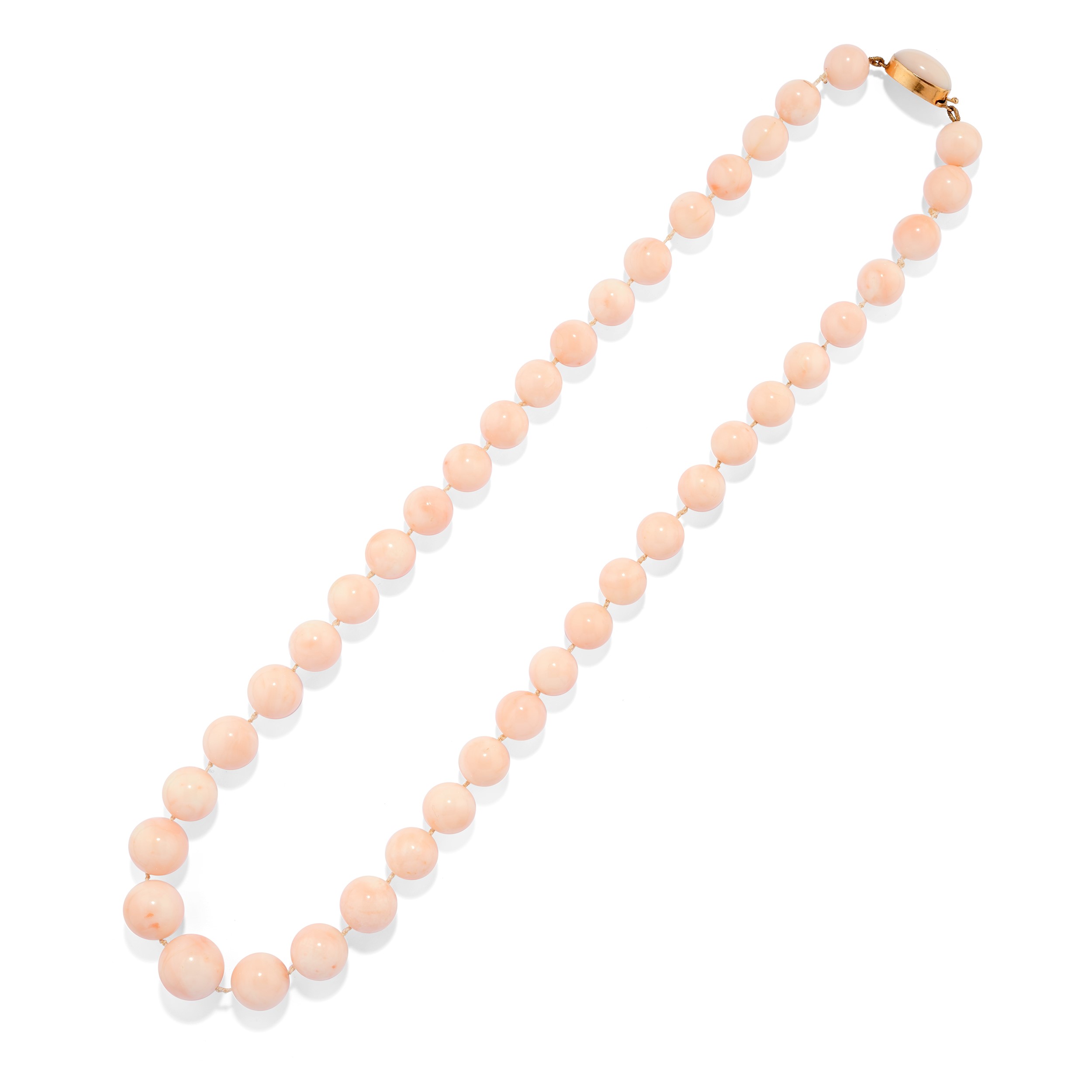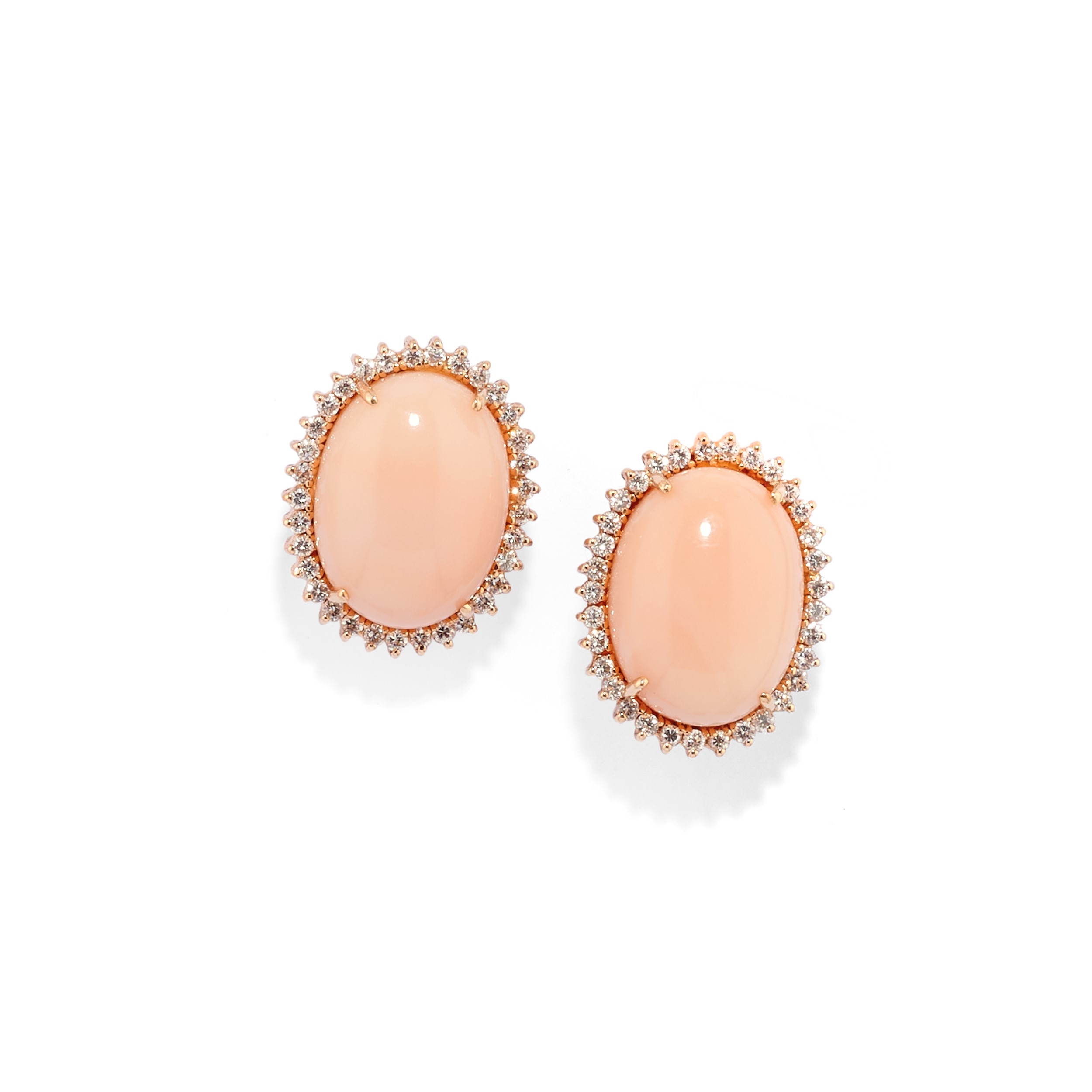 9k and 18k yellow goldcomprising a necklace with pink coral boules measuring approx. 17.00/12.00 mm, a pair of earrings with cabochon oval-cut coral and small diamonds, fitted with clips, and an oval-shaped ring with ribbed oval-cut pink coral and huit-huit-cut diamonds.