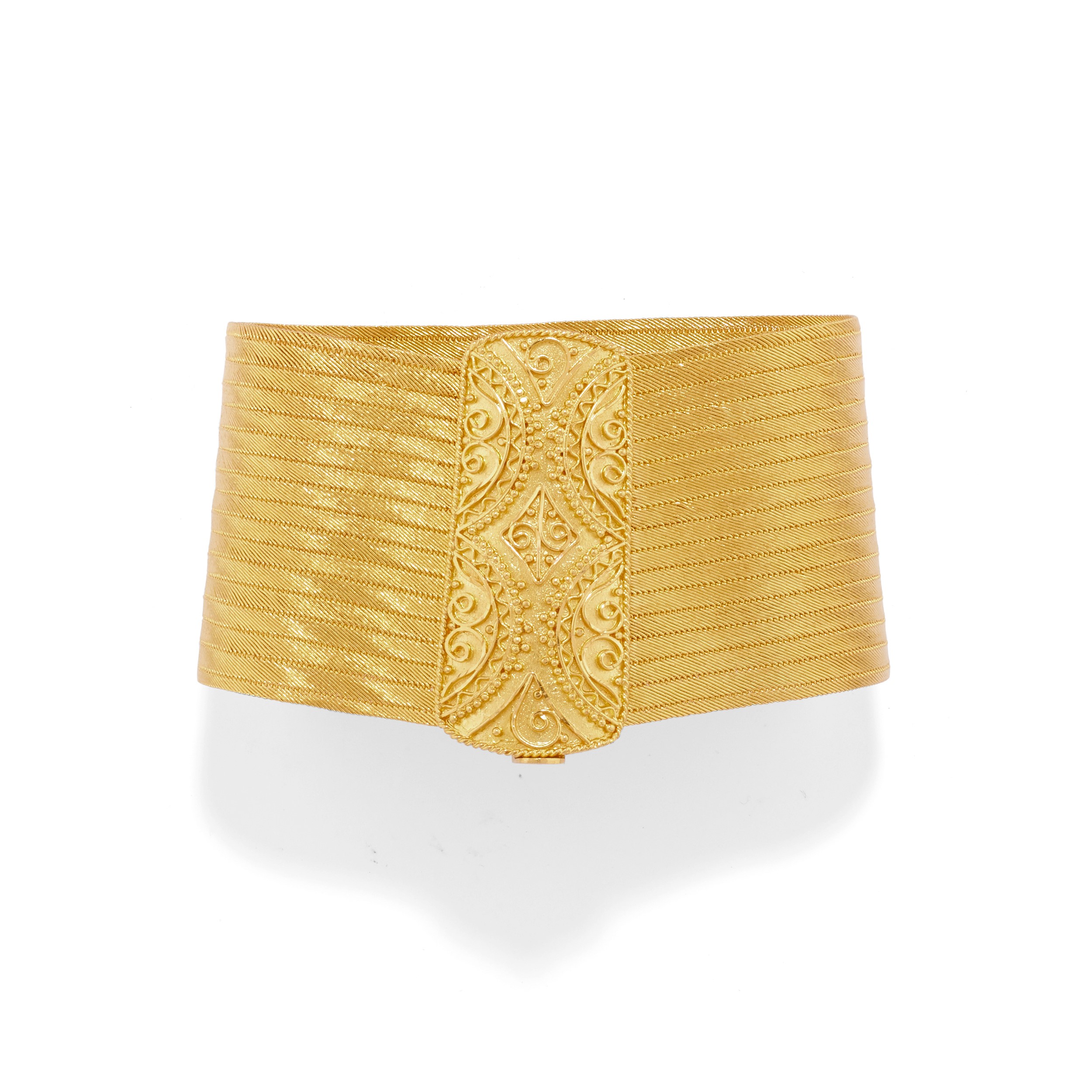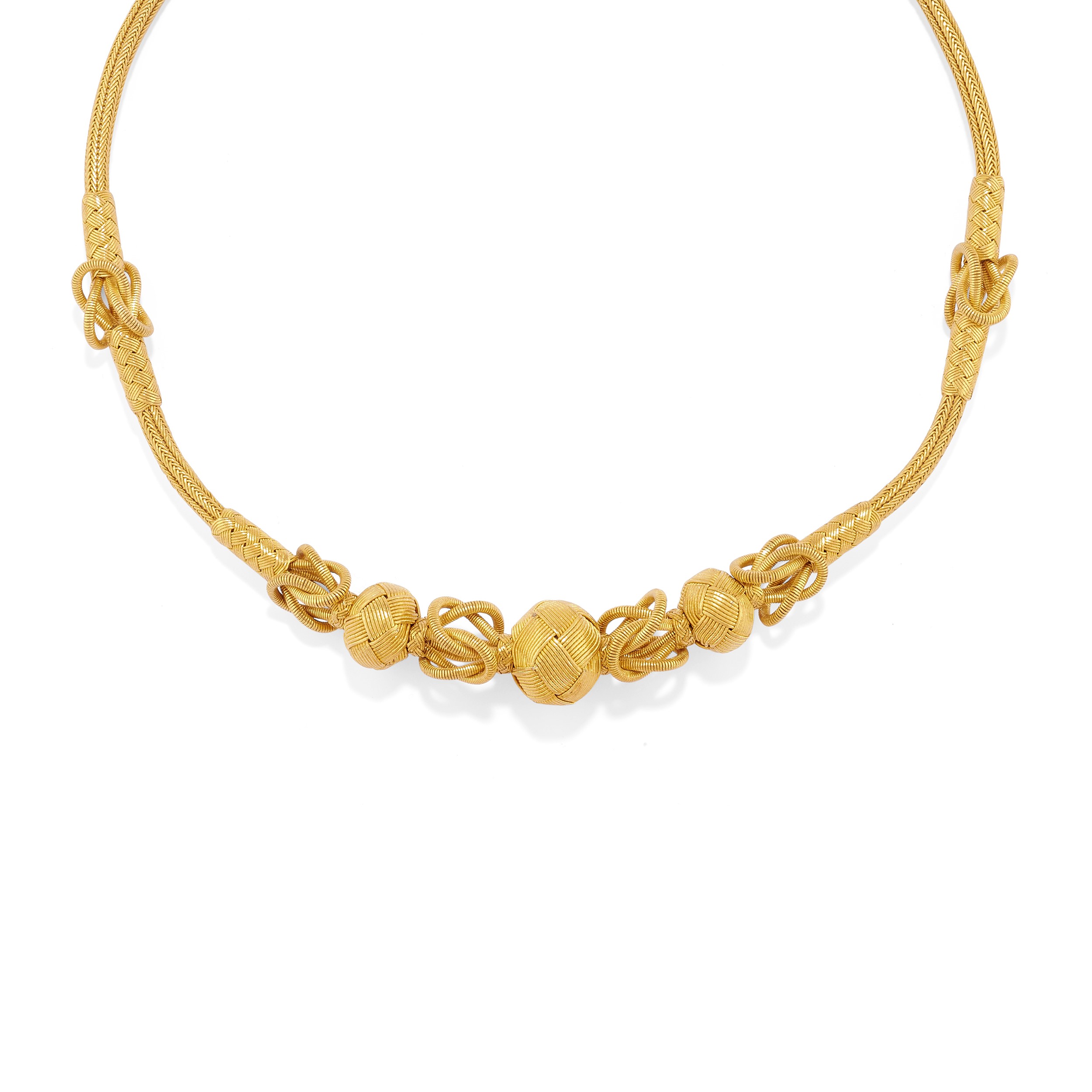 of Middle Eastern taste, ribbon bracelet with embossed buckle and necklace with boules.